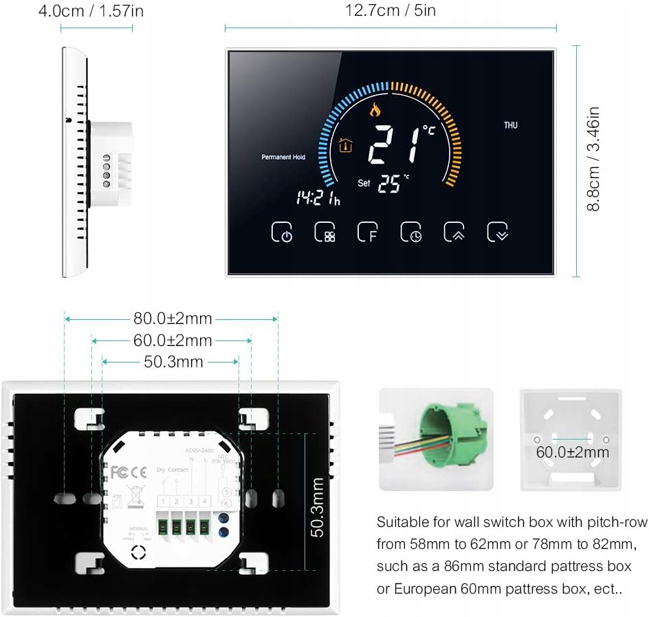 Большой 4,8-дюймовый цветной ЖК-дисплей с подсветкой, который легко читается ночью. Сенсорный экран упрощает операции. Видимая толщина над стеной составляет всего 15 мм. Нажмите и удерживайте кнопку в течение 5 секунд, чтобы заблокировать/разблокировать термостат. Вы можете заблокировать его полностью или частично.