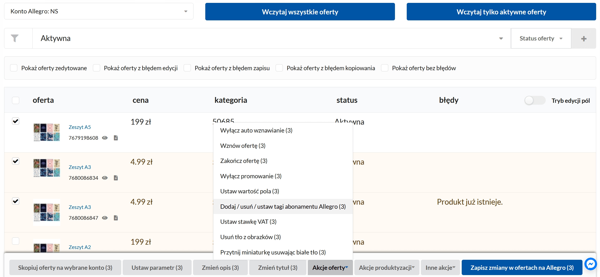 - массово копировать предложения или индивидуально между вашими аккаунтами Allegro,