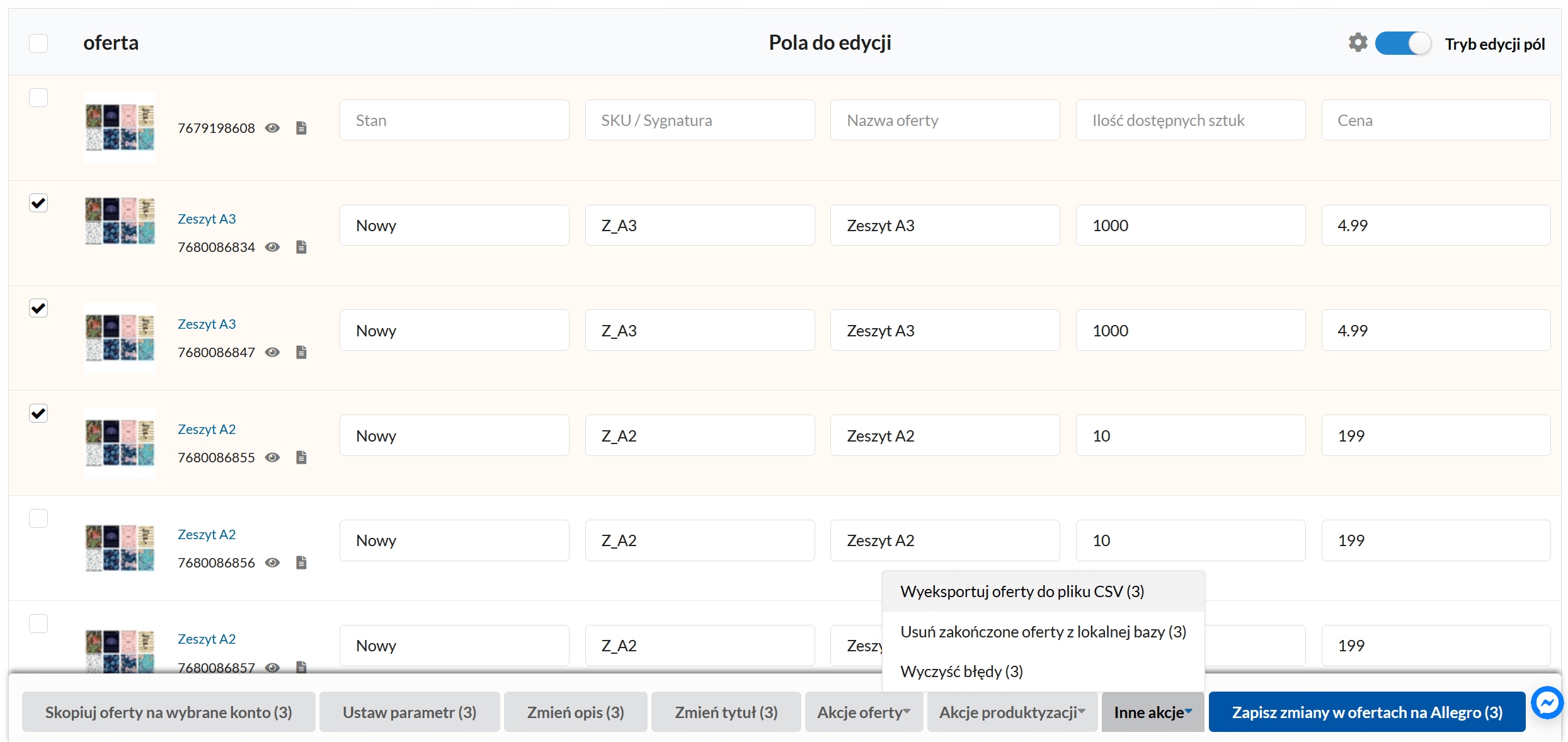 - экспортировать выбранные предложения Allegro в файл CSV,