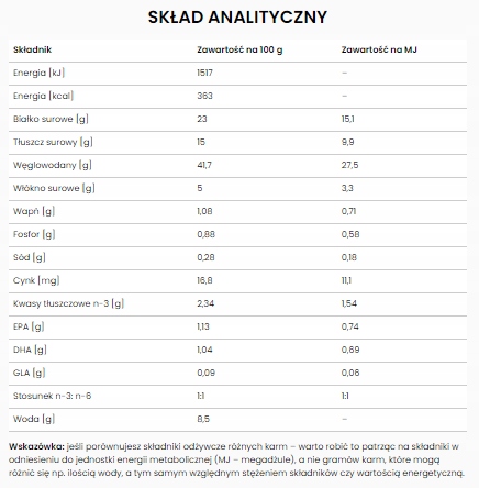 Состав: рис, рисовый белок, рыбий жир, гидролизованный белок лосося, порошкообразная целлюлоза, минеральные вещества, свиной жир, гидролизат белка (менее 10 000 дальтон), витамины и микроэлементы (включая хелатные микроэлементы), масло огуречника, шелуха подорожника. , экстракт розмарина.