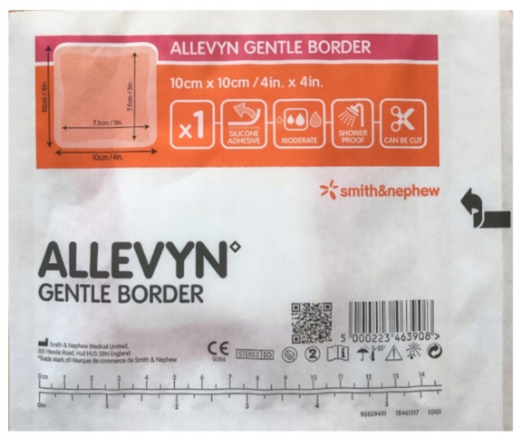 Smith & Nephew ALLEVYN Gentle Border — усовершенствованная самоклеящаяся повязка из пенополиуретана, покрытая силиконовым клеем, показанная для ран с умеренным экссудатом и нежной и чувствительной кожей вокруг раны. Стерильно.