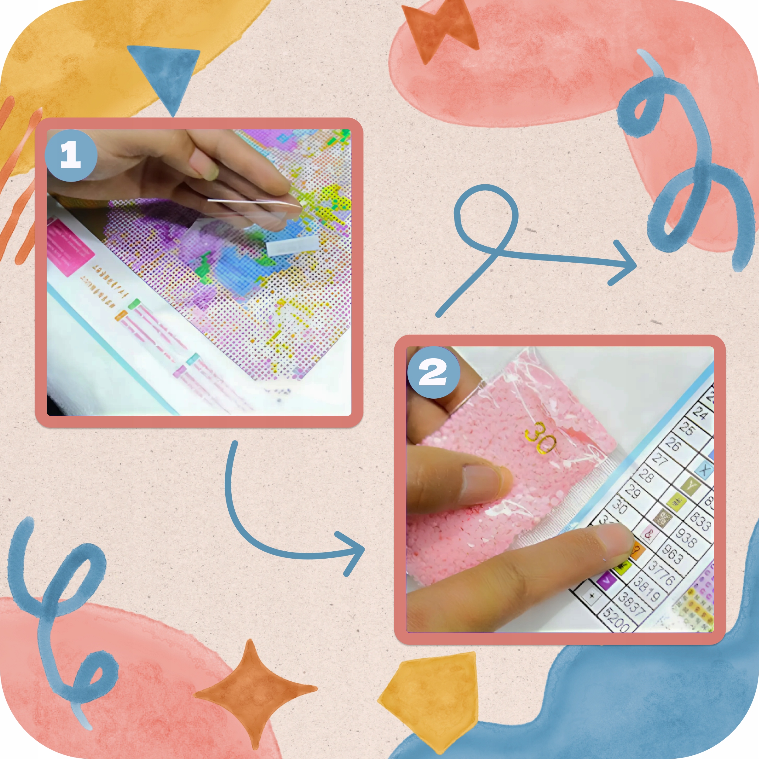 2️⃣ Выберите ромбы, которые будете приклеивать. Перелейте содержимое кристаллов выбранного цвета в пластиковый контейнер.