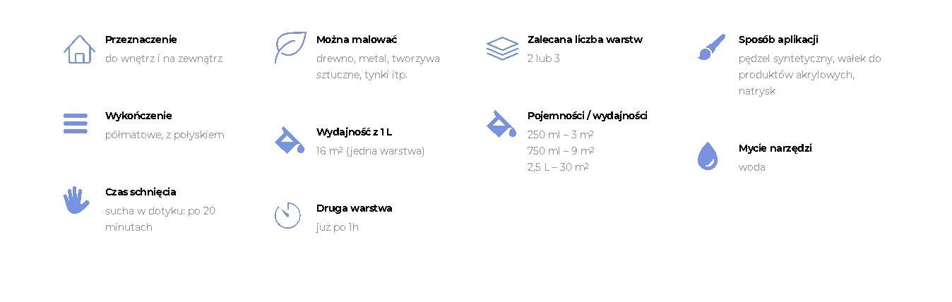 Акриловая быстрое -удирая эмаль предназначена для рисования металла, чугуна и деревянных поверхностей, поэтому она широко используется при выполнении отделки и ремонта. Получившиеся покрытие с глянцевой отделкой характеризуется высокой сопротивлением царапин и без страха безопасности, вы можете рисовать детскую мебель и игрушки. p> Рекомендуемое количество слоев: 2 или 3. > 1. Убедитесь, что окрашенная поверхность сухая и чистая. Откройте банку и осторожно смешайте подготовку, чтобы получить однородную последовательность. Поместите подготовку кистью для акриловых продуктов, роликом для акриловых продуктов или спрей. При покраске древесины покрасьте вдоль банок. Сразу после покраски вы должны тщательно мыть инструменты для рисования в чистой воде. Окрашенная поверхность сухой до ощущения через 20 минут, но следующий слой должен быть применен через 1 час 6 Нарисуйте поверхность точно так же, как с первым слоем. Если мы хотим применить третий слой, мы можем сделать это через более часа. После применения эмали окрашенные элементы могут быть аккуратно эксплуатированы через 24 часа и полностью эксплуатируются через 3 дня