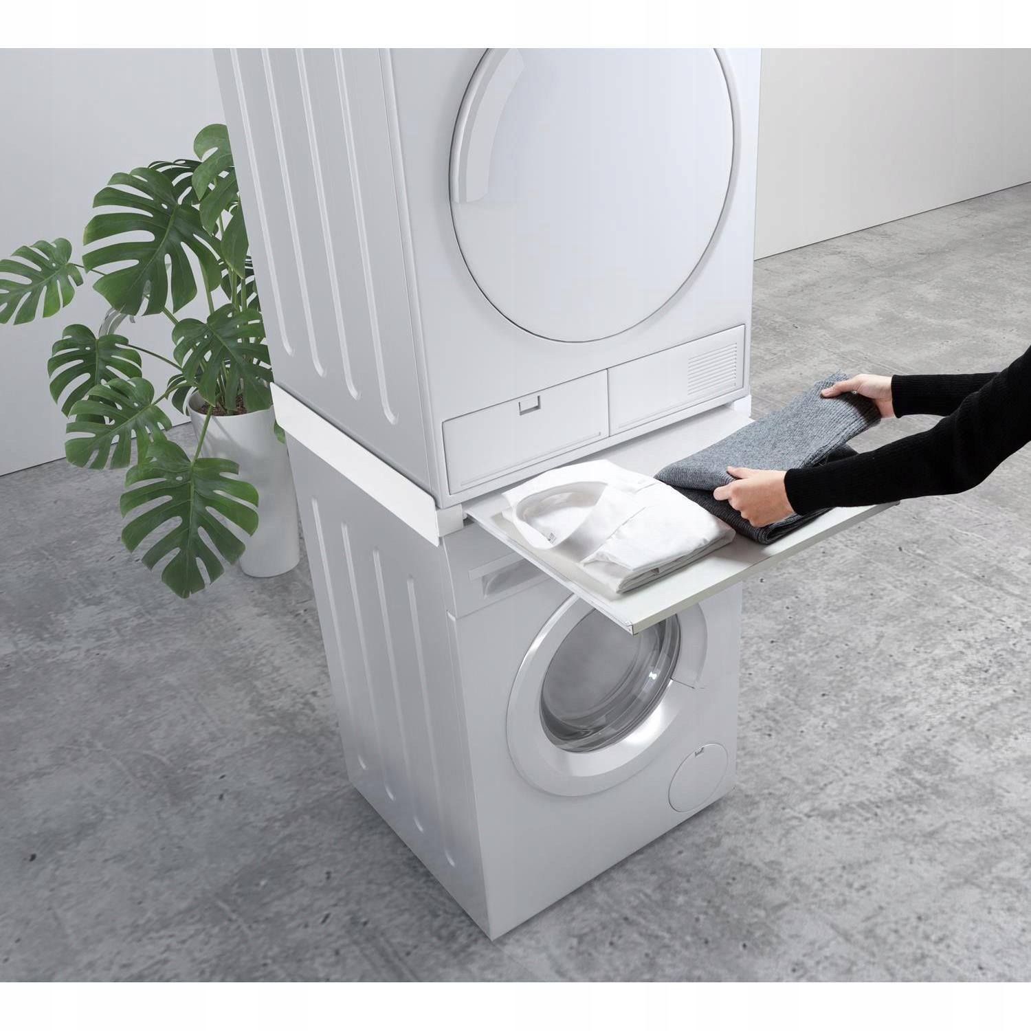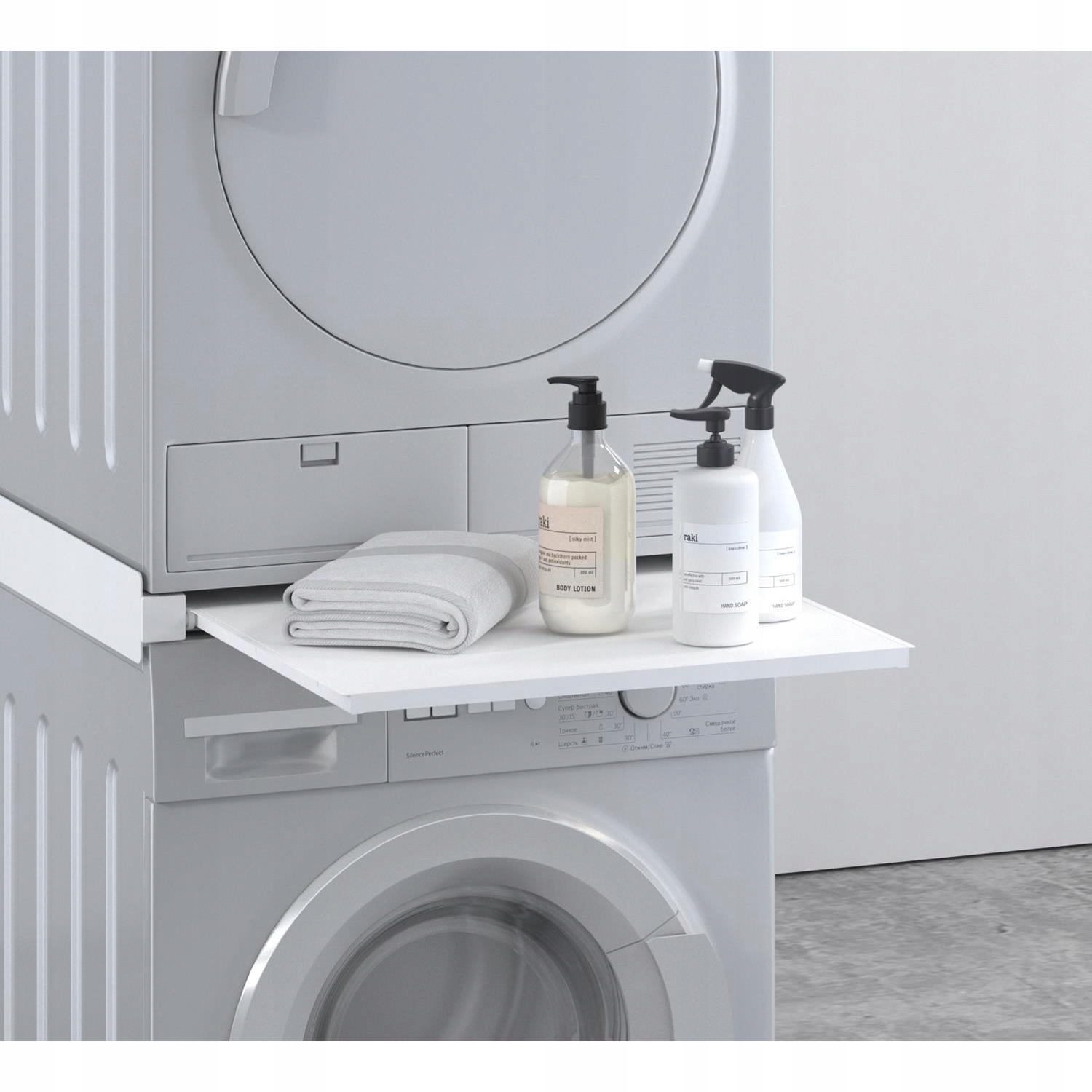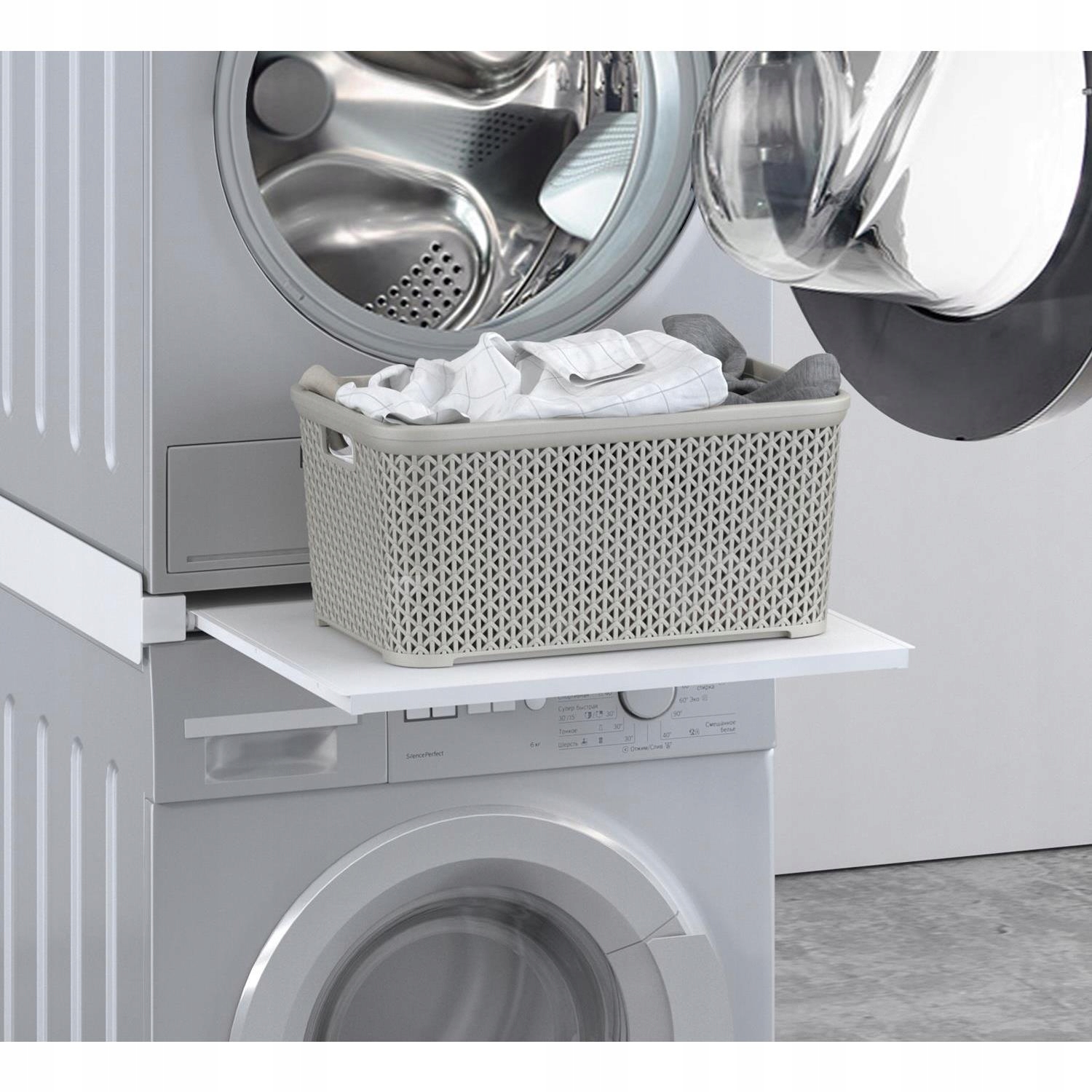 Благодаря удобной выдвижной полке можно загружать или вынимать белье, не наклоняясь. Максимальная загрузка полки — 8 кг, что позволяет разместить корзину для белья или хранить моющие средства.