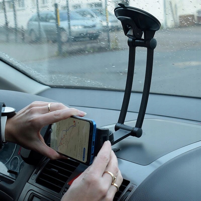 Держатель предназначен для крепления на лобовом стекле, кабине, столешницах, напр. Вы можете свободно расположить его вертикально, горизонтально и под углом.Гелевая присоска в основании держателя прочно прилегает даже к самым шероховатым поверхностям.