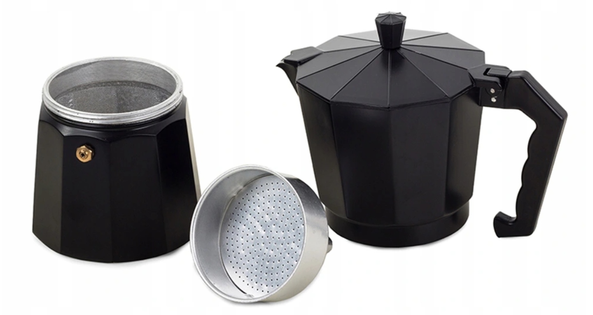 Кофеварка полностью изготовлена из алюминия. Подходит для газовых и электрических плит.
