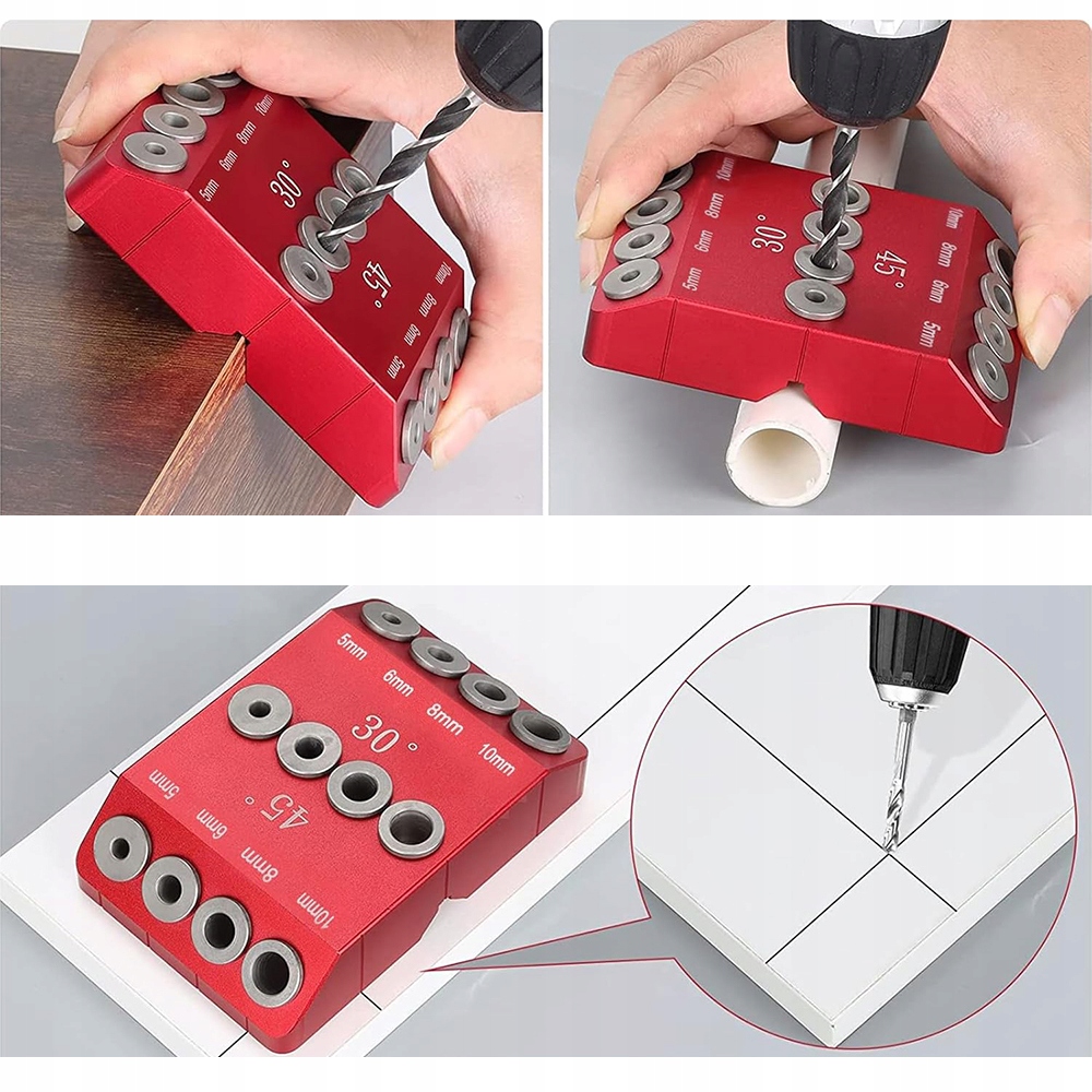 Каждый уголок имеет направляющие отверстия четырех размеров: 5 мм, 6 мм, 8 мм и 10 мм, что обеспечивает совместимость с большинством сверл, доступных на рынке.