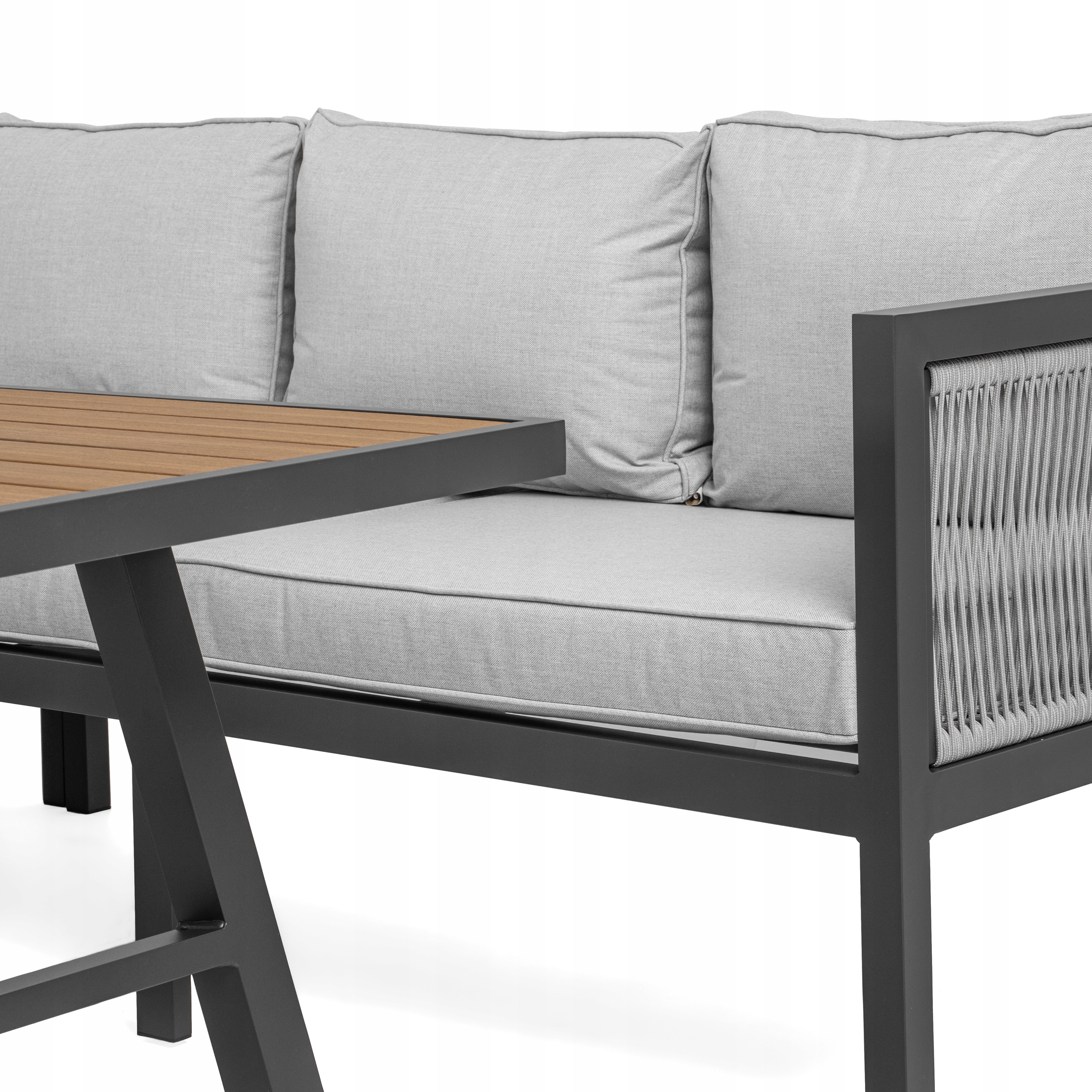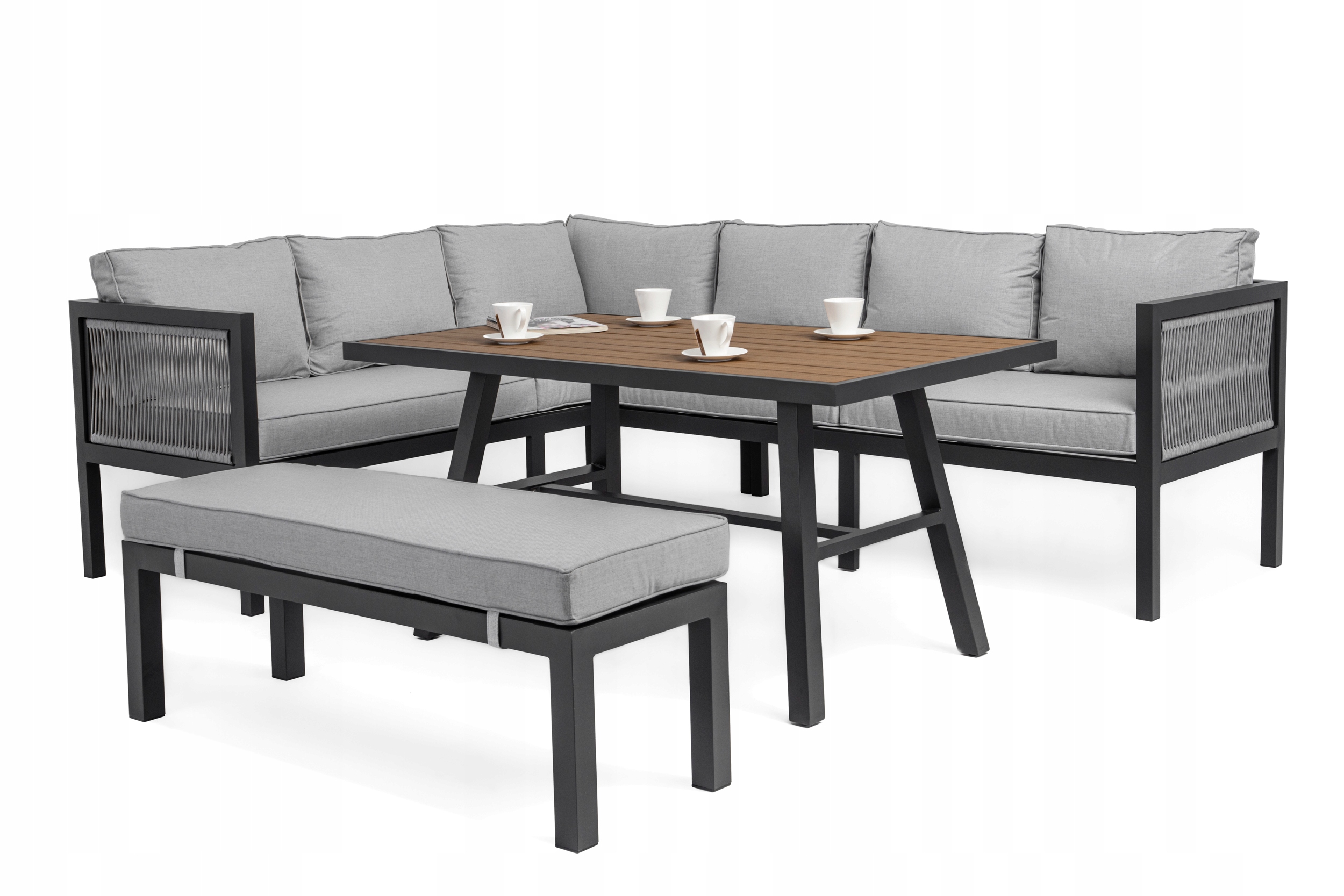 Portofino от NEW HOME Garden — это угловой обеденный гарнитур для любого патио, сада или террасы. Этот угловой гарнитур объединяет в себе диван 2 х 3-местный, скамейку и обеденный стол. Он идеально подходит для отдыха с друзьями и семьей в саду, а также для ужина на свежем воздухе. Отличным стильным дополнением к этому угловому дивану является удобный пуфик.