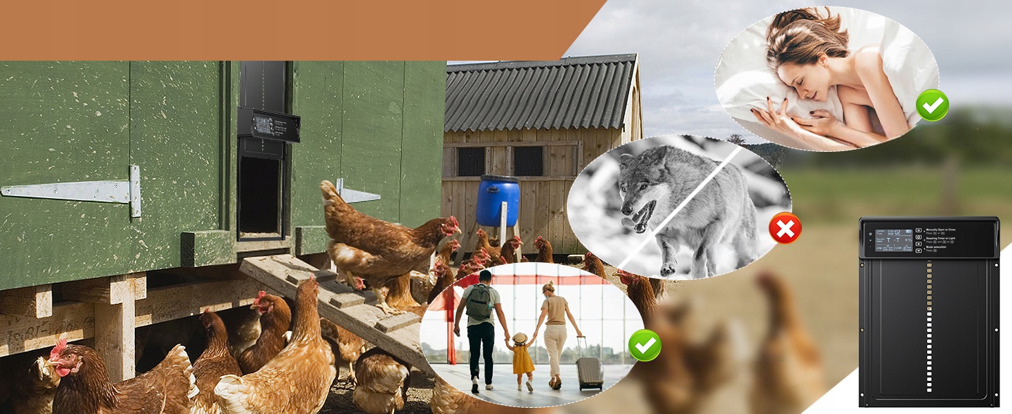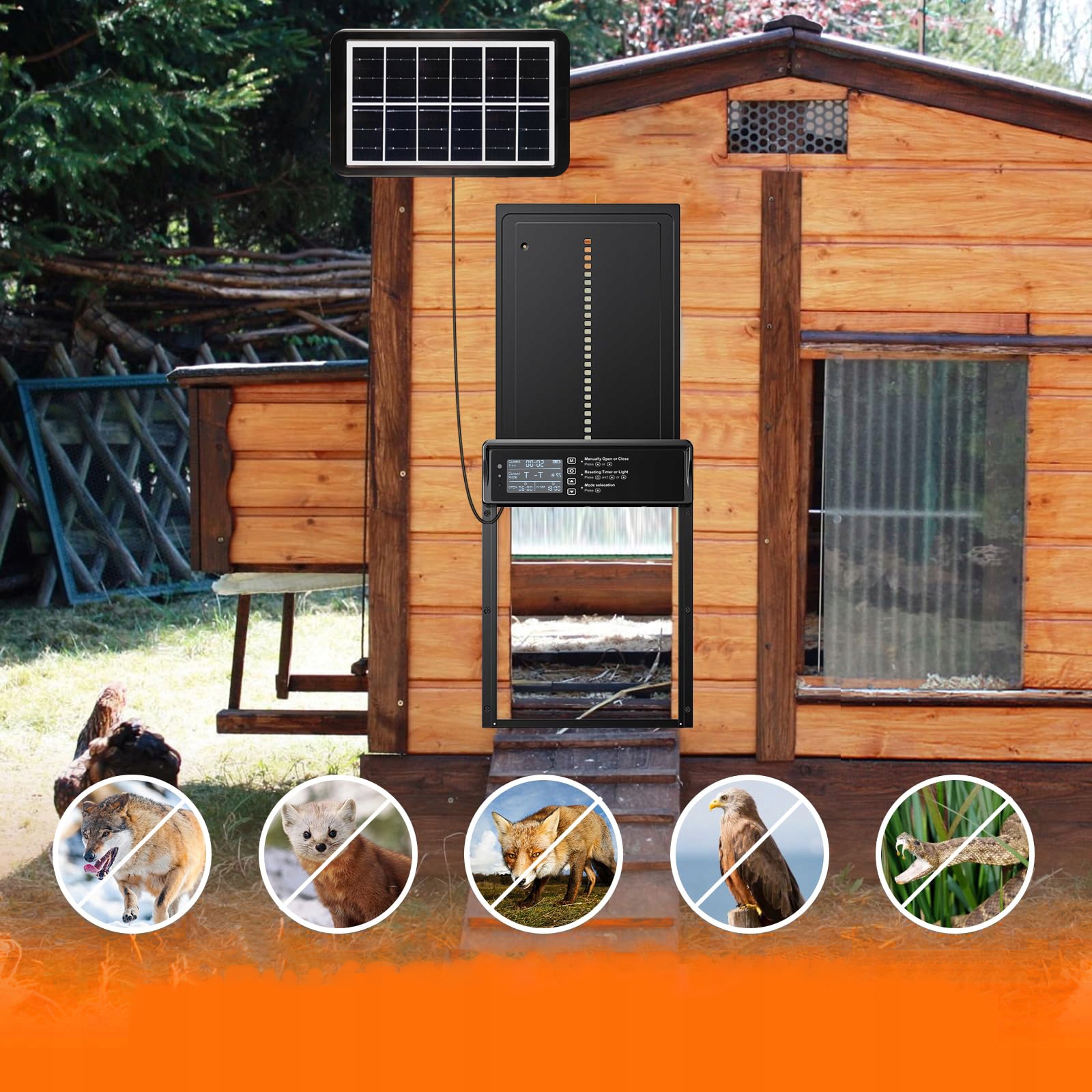 【Интеллектуальная защита от защемлений】: Безопасность – наш приоритет. Наши двери оснащены передовой технологией защиты от запирания. Если автоматическая дверь курятника при закрытии встретит препятствие, устройство автоматически обнаружит это, дверь поднимется примерно на 3 см и снова закроется через 10 секунд. Как только препятствие будет устранено, дверь полностью закроется, исключая риск попадания цыплят в ловушку. Благодаря этому ваши куры останутся в безопасности.