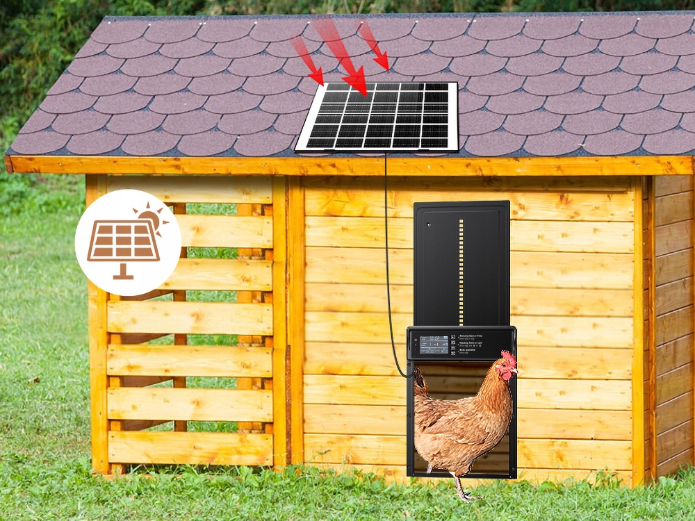 Эта электрическая алюминиевая автоматическая дверь для курятника оснащена встроенным аккумулятором емкостью 2000 мАч, который можно заряжать через USB Type-C, и его хватает на два месяца без подзарядки. Их также можно заряжать с помощью солнечной энергии, что защищает окружающую среду и экономит энергию. Оба метода зарядки обеспечивают более стабильное время автономной работы. Примечание. Рекомендуется устанавливать солнечную панель в месте, подверженном воздействию прямых солнечных лучей.