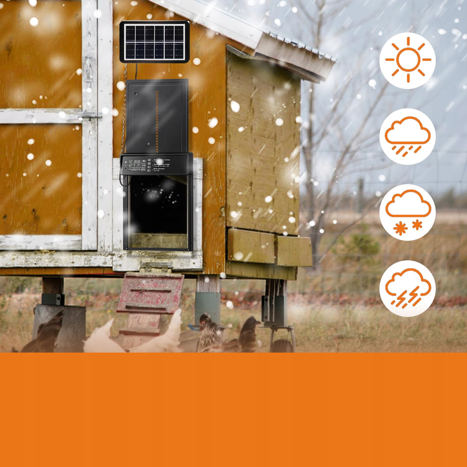 Водонепроницаемость IP45, устойчивость к погодным условиям, морозу, прочность и долговечность. Может использоваться при температуре от -15°С до 60°С. За пределами этого диапазона температур используйте ручной режим для открытия и закрытия двери!