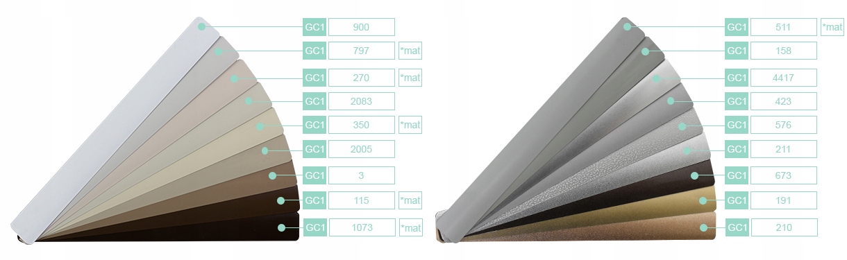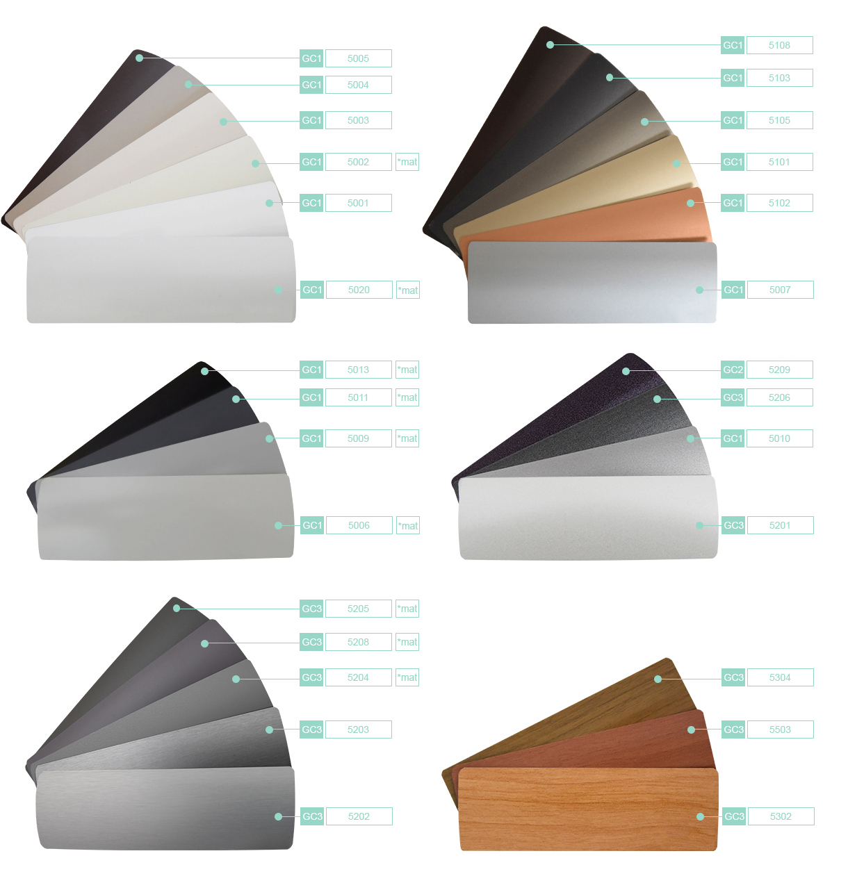 Алюминиевые жалюзи доступны в четырех размерах: 16 мм, 25 мм, 35 мм и 50 мм. Цвета доступны в разных ценовых группах (GC1 — самый дешевый, GC5 — самый дорогой).