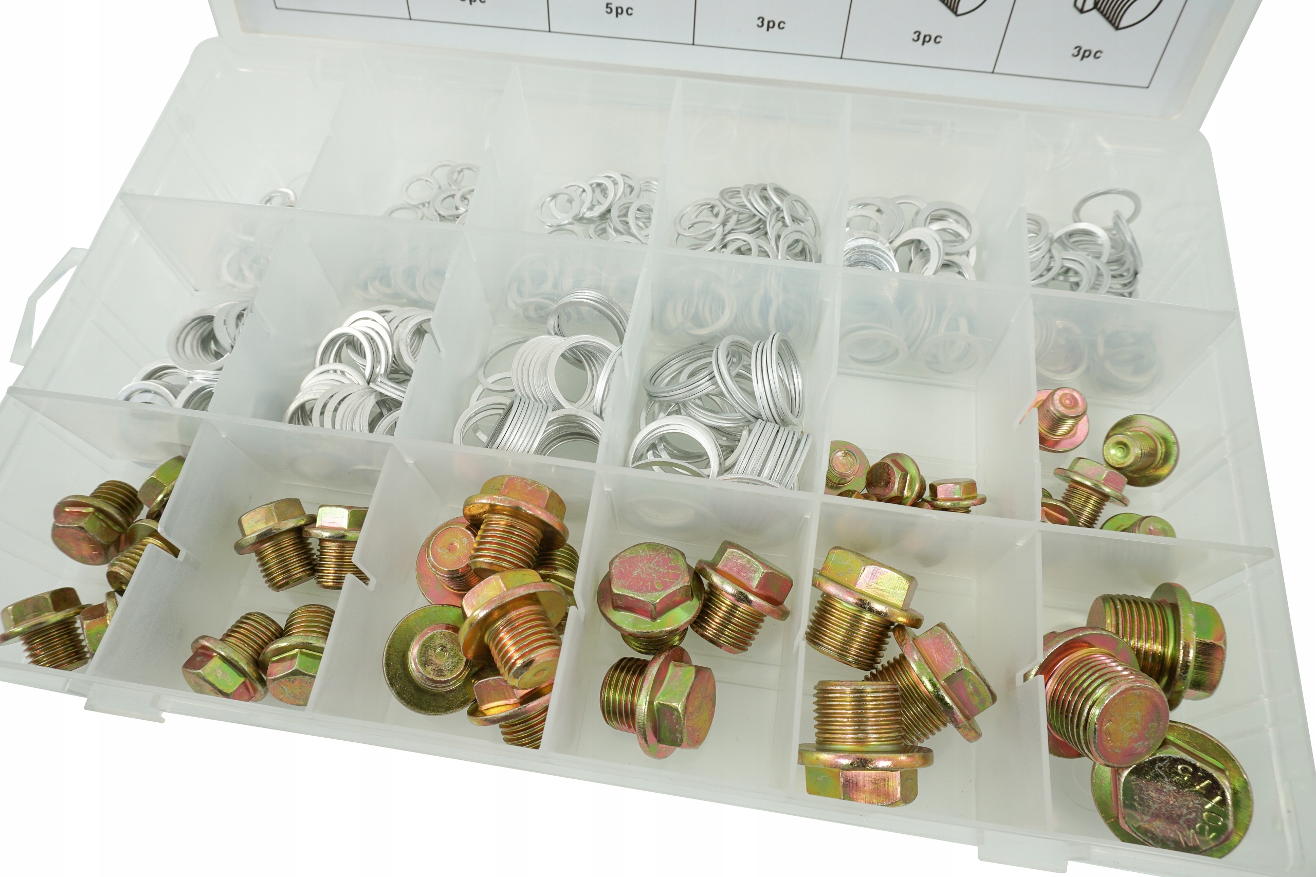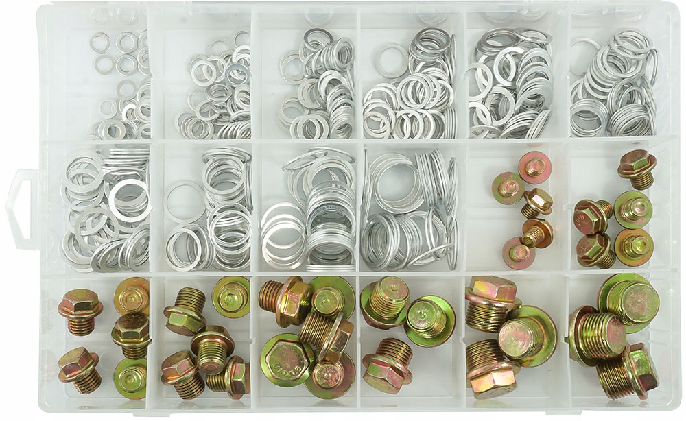 алюминиевые прокладки и сливные заглушки 534 ПК. Комплект включает в себя размеры от 6 мм до 20 мм. Целое помещено в удобную упаковку «сортировщика».