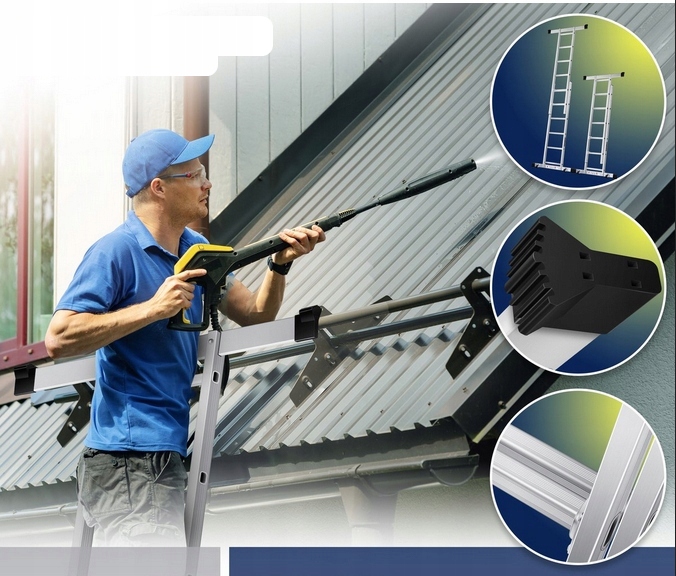 Функциональное использование: Вы выбираете универсальный помощник для многих задач благодаря алюминиевым каркасам. Эта большая многофункциональная лестница может использоваться в качестве лесов, лестницы или платформы. Дополнительным преимуществом является высокая стабильность и деревянная рабочая платформа с неразличительным покрытием, которое обеспечивает безопасность во время работы.