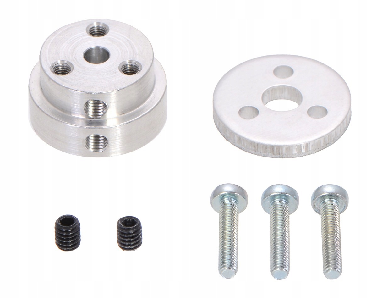 Алюминиевый адаптер предназначен для передачи мощности от моторов с валом 4 мм на колеса самоката/скейта. Он состоит из двух частей – элемента, установленного на двигателе, и элемента, установленного на колесе. Элемент, закрепленный на колесе, имеет центральное отверстие, благодаря которому через него может проходить вал навесного двигателя. При сборке обратите внимание на правильный порядок установки элементов: сначала установите элемент, установленный на двигатель, и затяните прижимные винты, затем установите второй элемент на колесо.