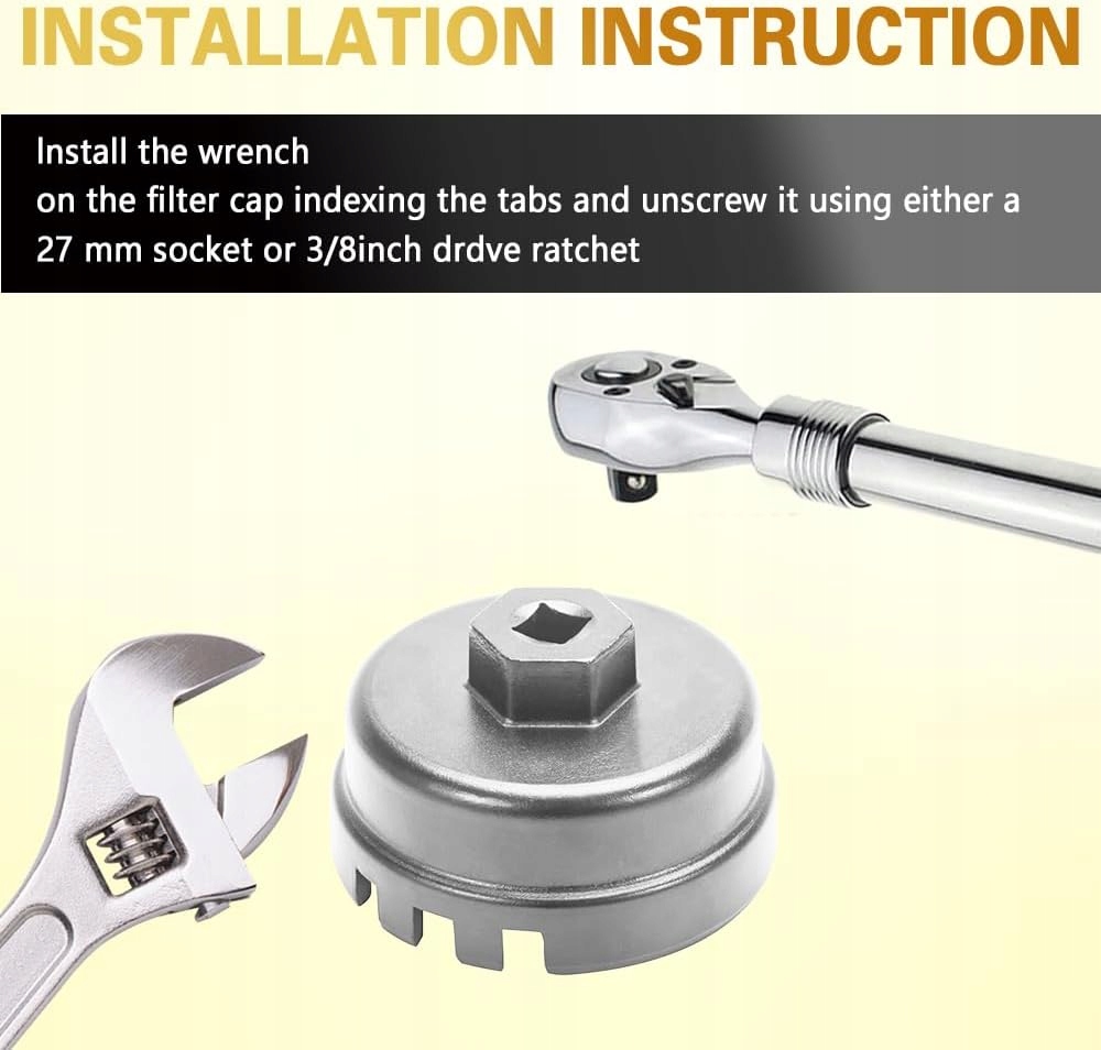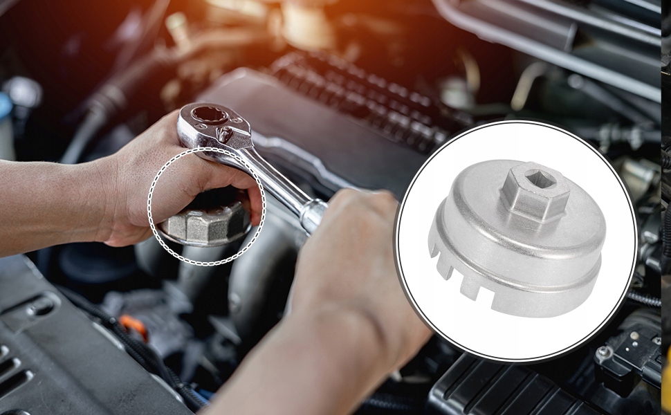 Установка. Легко установите и замените поврежденный ключ для крышки масляного фильтра без специального инструмента.