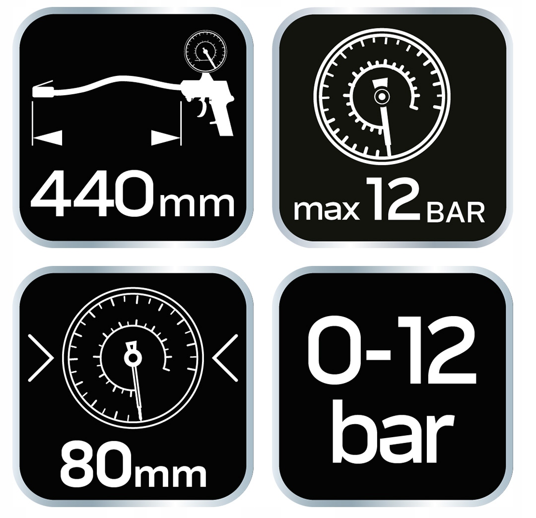 Neo Pucling Pistol с даткой давления, изготовленного из алюминия. Максимальное рабочее давление 12 бар. Он имеет практическое подвесное крючок и шланг длиной 440 мм. С большой, четкой шкалой, которая облегчает точное измерение давления. Сертификат CE подтверждает высокое качество инструмента. Бренд NEO соответствует ожиданиям профессионалов.