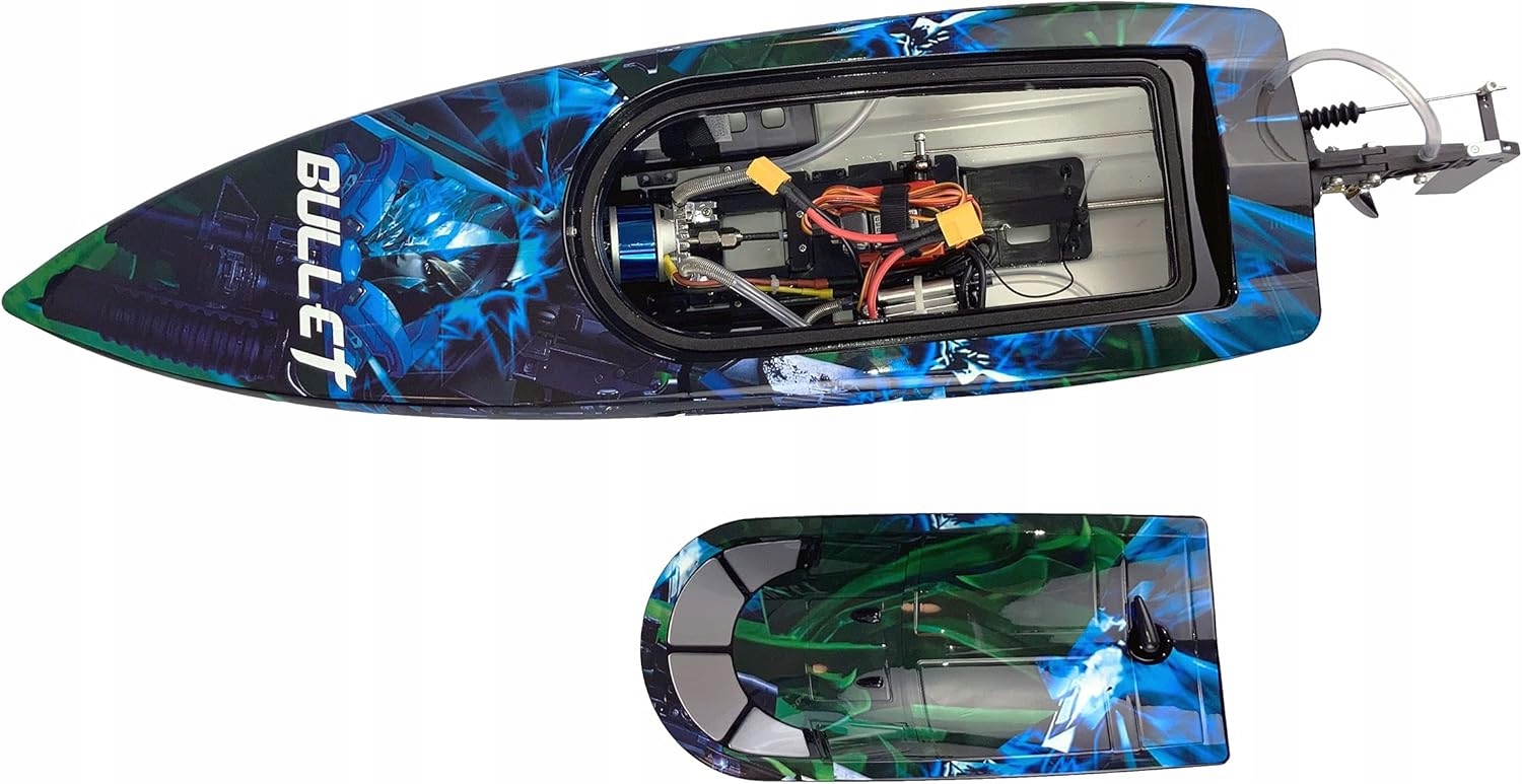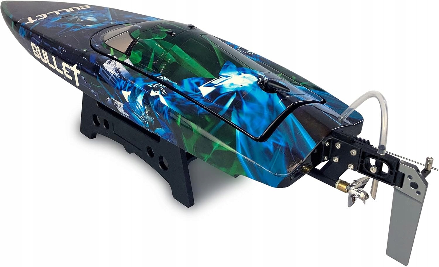 Fast Bullet V4 Speedboot Engine со скоростью прибл. Стоит увидеть, как лак подчеркивает спортивный характер этой гоночной лодки. Система заглушек модели была изменена на контакты XT60, чтобы полностью использовать потенциал. Готовое водяное охлаждение обеспечивает дополнительную безопасность, а передатчик 2,4 ГГц, хорошо лежащий в вашей руке Гребная машина и винт изготовлены из высококачественного металла.