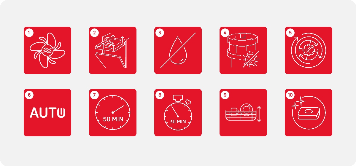 Идеальная выпечка – это не только вопрос мастерства, но, прежде всего, правильной духовки. Новая конструкция камеры с увеличенным нагревателем тостера гарантирует идеальное, равномерное распределение тепла и стабильную температуру во всей духовке. Благодаря этому вы сможете приготовить большую партию выпечки, зная, что она подрумянится и пропечется равномерно. Камера также стала больше и имеет больше уровней выпечки — теперь можно убить сразу нескольких зайцев! Противни также стали больше, а новая крышка вентилятора ускоряет нагрев — до 150°C всего за 3 минуты! С BakingPro System® вы сможете печь больше, быстрее, лучше и удобнее – и повседневные обязанности станут удовольствием!
