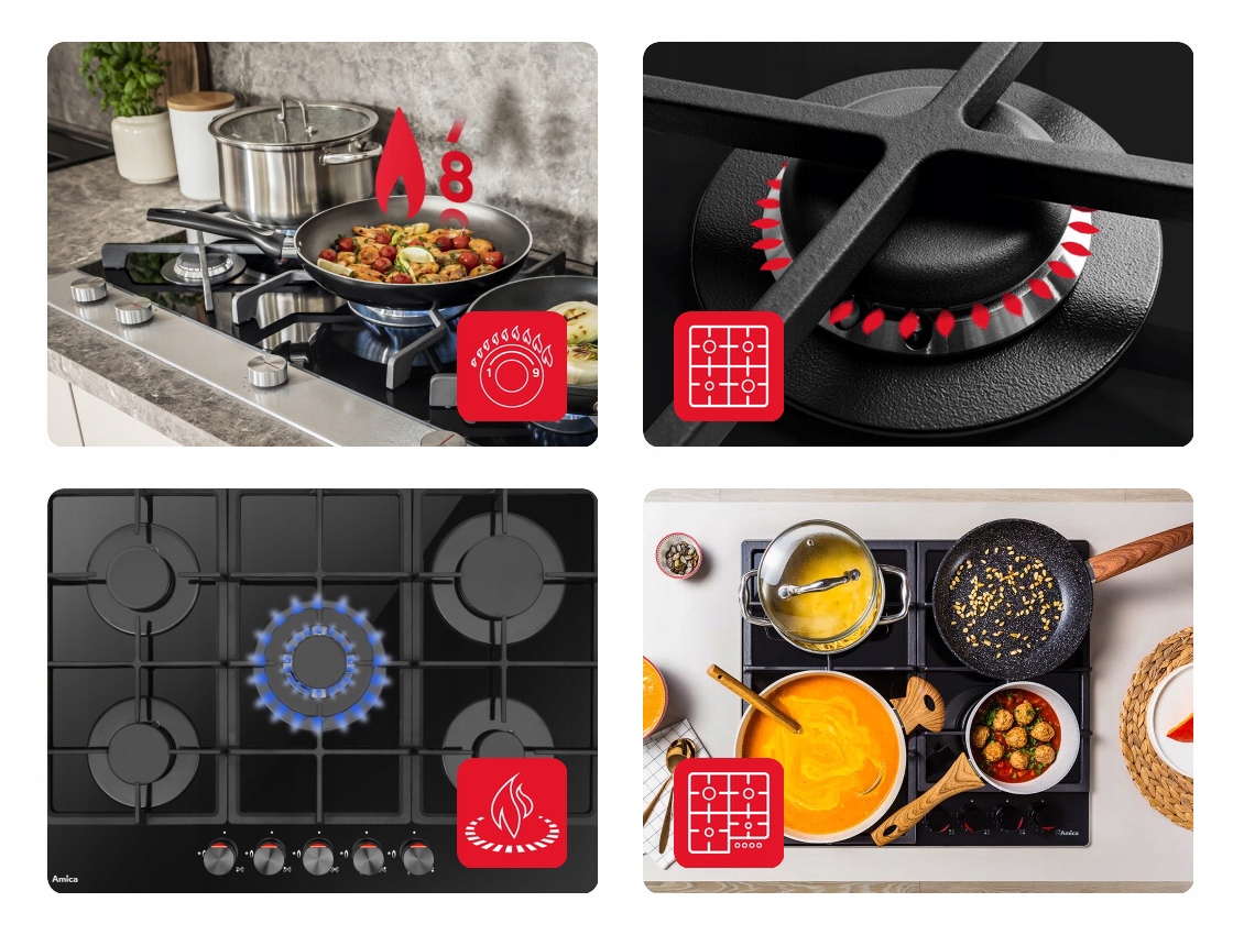 Отныне газовые варочные панели Amica имеют полный контроль над огнем. Благодаря 9 уровням мощности и интуитивно понятным ручкам вы можете точно настроить размер пламени в зависимости от типа готовящегося блюда. Меньшее пламя, на уровне 2–3, идеально подходит для тушения продуктов, уровни 6–7 оптимальны для приготовления овощей, а уровни 8–9 – для жарки мяса или рыбы. Готовите ли вы, тушите, разогреваете или жарите – регулируйте размер пламени в соответствии со своими потребностями и оптимально используйте энергию! Комфортно, экономично и вкусно!
