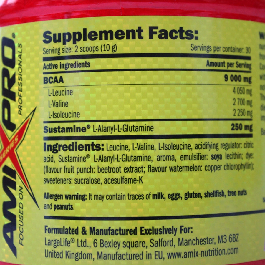 <ул>Состав: L-лейцин, L-валин, L-изолейцин, регулятор кислотности: лимонная кислота, L-аланил-L-глутамин Сустамин®, ароматизатор, эмульгатор: соевый лецитин; краситель: (вкус фруктового пунша: экстракт свеклы; ароматизатор арбуза: комплексы хлорофилла меди и хлорофиллина); подсластители: сукралоза, ацесульфам-К;
