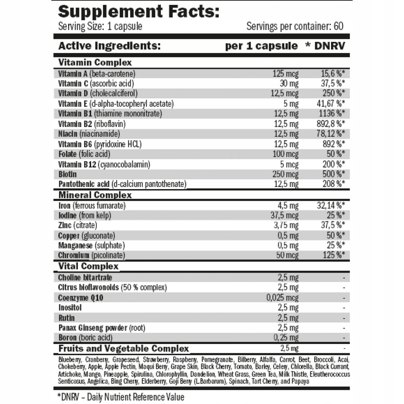 Состав в 1 капсуле:масло рисовых отрубей, желатиновая капсула (желатин, краситель: хлорофилл); аскорбиновая кислота (вит. С 30 мг - 37,5%*), карбонат кальция (кальция), тиамина мононитрат (вит. В1 - 12,5 мг - 1136%*), рибофлавин (вит. В2 - 12,5 мг - 892,8%*), ниацинамид (ниацин 12,5 мг - 78,12%*), пиридоксина HCL (витамин В6 - 12,5 мг - 892%*), d-пантотенат кальция (пантотеновая кислота 12,5 мг) - 208%*), цитрат калия (калий), оксид магния (магний) ), селеновые дрожжи (селен), d-альфа-токоферилацетат (витамин Е 5 мг – 41,67%*), фумарат железа (железо 4,5 мг – 32,14%*), цитрат цинка (цинк 3,75 мг – 37,5%*) , битартрат холина 2,5 мг, цитрусовые биофлавоноиды 50% комплекс 2,5 мг, инозитол 2,5 мг, рутин 2,5 мг, женьшень (корень) 2,5 мг, экстракты овощей и фруктов 2,5 мг (черника, клюква, виноградные косточки, клубника, малина, гранат, черника) , ячмень, сельдерей, хлорелла, черная смородина, артишок, манго, ананас, спирулина, хлорофилл, одуванчик, пшеница, зеленый чай, расторопша, ложный женьшень, дудник, вишня , бузина, годжи, грейпфрут, восхитительный мангостин, шпинат, папайя вишневая); глюконат меди (0,5 мг - 50%*), сульфат марганца (0,5 мг - 25%*), биотин 250 мкг - 500%*, борная кислота (бор) 0,25 мг, бета-каротин (витамин А 125 мкг - 15,6%* ), фолиевая кислота 100 мкг - 50%*, пиколинат хрома (хром 50 мкг - 125%*), йод (из морских водорослей 37,5 мкг - 25%*), холекальциферол (витамин D 12,5 мкг - 250 %*), цианокобаламин (вит. В12 5 мкг - 200%*), коэнзим Q10 - 0,025 мкг;