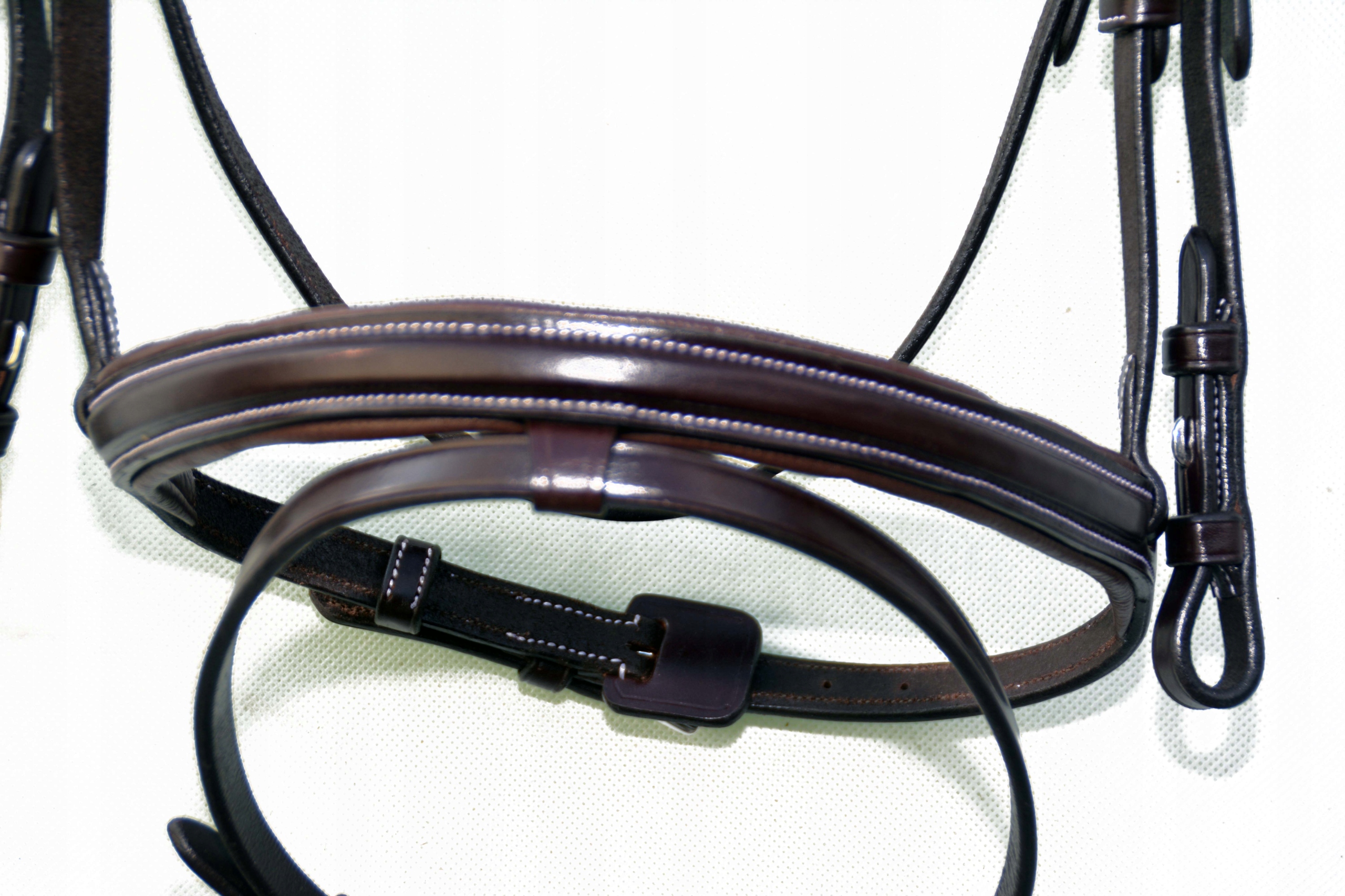 Уздечка анатомического профиля, ПОЛНЫЙ размер Уздечка изготовлена на шорной фабрике в Англии. Изготовлен из отборной английской коровьей кожи, очень мягкой и приятной на ощупь, затылочная часть и надбровная полоса обтянуты мягкой кожей для предотвращения потертостей. Уздечка застегивается и регулируется с помощью устойчивых пряжек, изготовленных из очень хорошей нержавеющей стали. Смело покупайте. Уникальная уздечка, единственная на польском рынке.