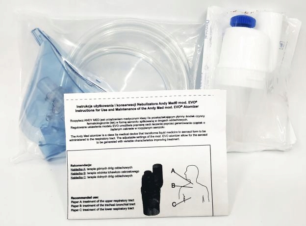 В комплект входит небулайзер AndyMed Evo. На данный момент это самый быстрый контейнер для введения лекарств на рынке. Выпускает 1 мл за одну минуту (при ингаляторе с расходом 15 литров). Также есть возможность регулировки размера частиц. Он оснащен тремя разными насадками, которые соединяются в основании небулайзера, а настроить соответствующую накладку очень просто: