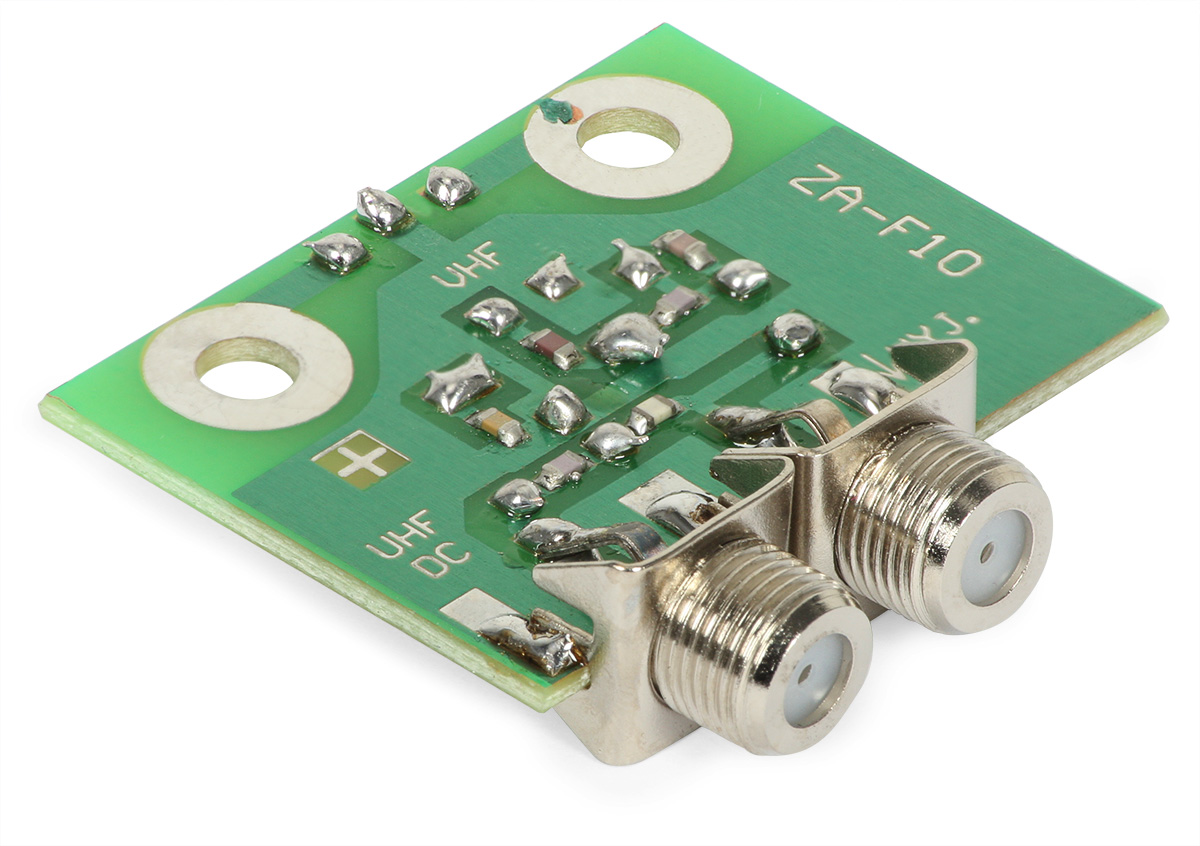 Диплексор скрытого монтажа УКВ+УВЧ ZA-F10 используется как элемент, объединяющий сигналы FM/УКВ (5-230 МГц) и ДМВ (470-790 МГц) антенн. Кроссовер имеет встроенный симметризатор, позволяющий монтировать его непосредственно в антенные коробки УКВ.