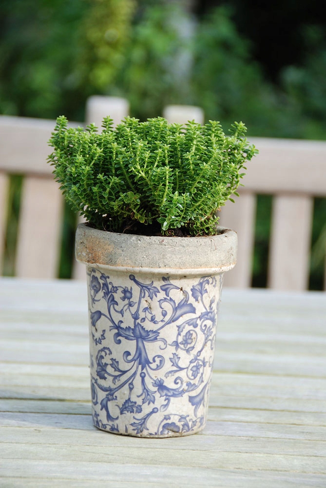 Горшок украшен элегантным сине-белым принтом и дренажное отверстие.