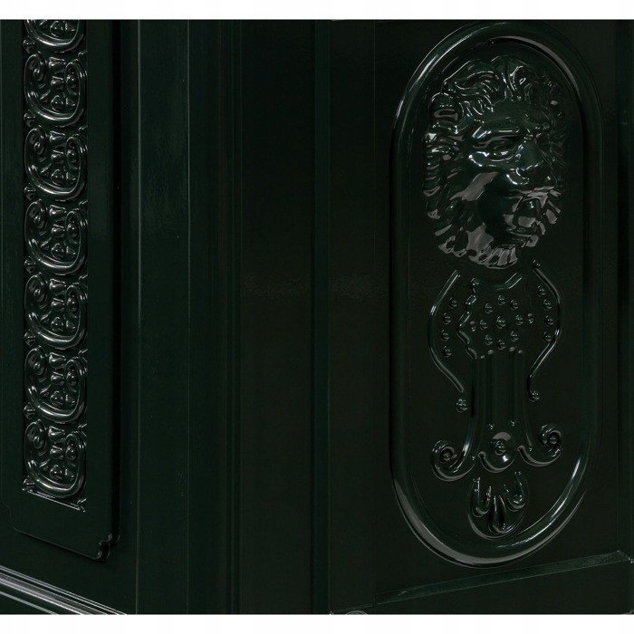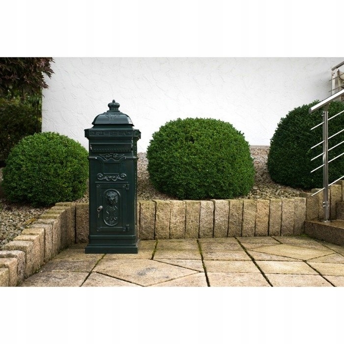 У него украшения со всех сторон. Изготовлен из литого алюминия, он чрезвычайно прочен и устойчив к ржавчине. Подходит для почты формата А4, газет и журналов. Внутренняя емкость составляет целых 0,15 м³. Он предназначен для всех любителей античного стиля и тех, кто хочет придать своему окружению неповторимый вид и характер. Запирается (два ключа в комплекте). Изделие отличается высоким вниманием к деталям и надежностью. Имеет дополнительную полку, которую можно снять для увеличения внутреннего объема (практично, например, во время длительного отсутствия). Без полки почту можно вынимать через нижнюю дверцу в передней части почтового ящика, а со вставленной полкой почту можно вынимать через верхнюю дверцу сзади.