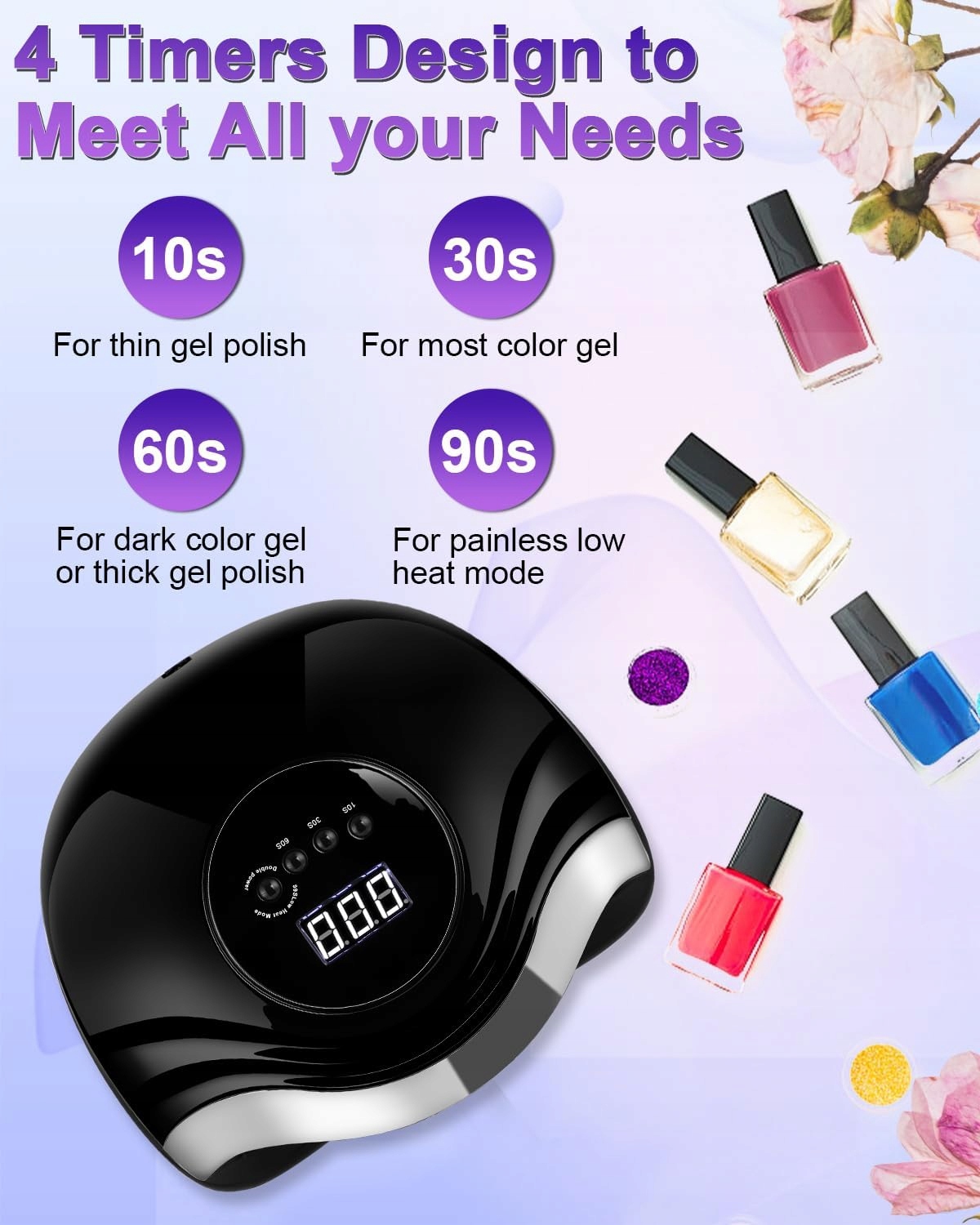 - СВЕТОДИОДНАЯ СУШИЛКА ДЛЯ НОГТЕЙ 168 Вт И СУПЕРБЫСТРАЯ СУШКА: УФ-светодиоды мощностью 168 Вт на основе передовой технологии двойной длины волны (365 нм + 405 нм) позволяют быстро сушить различные типы лака для ногтей, стразы и отверждаемый клей. Оснащенный одновременно 36 долговечными светодиодами, ногти, покрытые лаком, можно быстро высушить, а время отверждения сокращается на 80%.