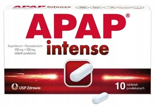 Таблетки Aap Intense, покрытые оболочкой, представляют собой лекарственное средство, содержащее комбинацию парацетамола и ибупрофена. Эти вещества снижают жар и облегчают боль, но своего терапевтического эффекта они достигают по-разному и действуют вместе более эффективно, чем по отдельности. Апап интенсив применяют при кратковременном лечении умеренной и легкой боли: головной, зубной, спинной, менструальной и мигренозной боли. Таблетки также используются для лечения симптомов гриппа или простуды, таких как лихорадка. Препарат предназначен для взрослых.