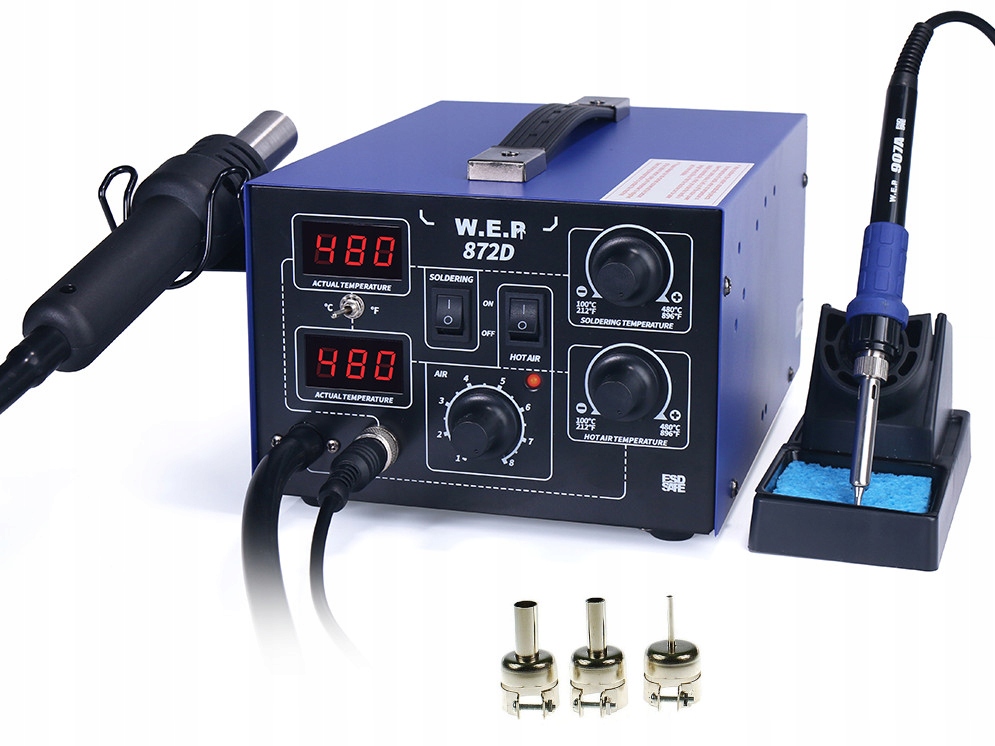 Сварочный аппарат WEP 872D — это 2-в-1 устройство горячего воздуха для сварки пластика и сварочный аппарат с наконечником, используемый для распайки и пайки электронных систем