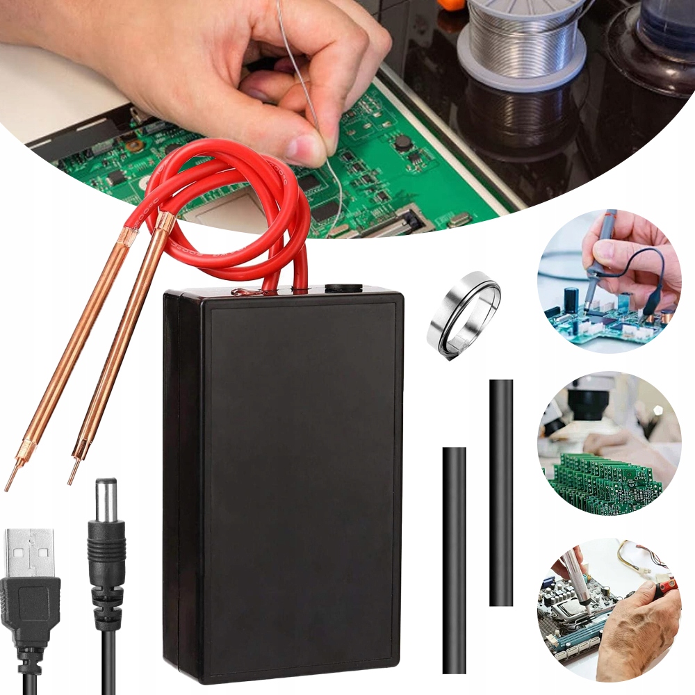 14 х 4 х 8 см >. Комплектация: 1 аппарат для точечной сварки с 2 сварочными штифтами; 2шт х втулка сварочного штифта; 1 шт. никелевая пластина; 1 шт. USB-кабель для зарядки.