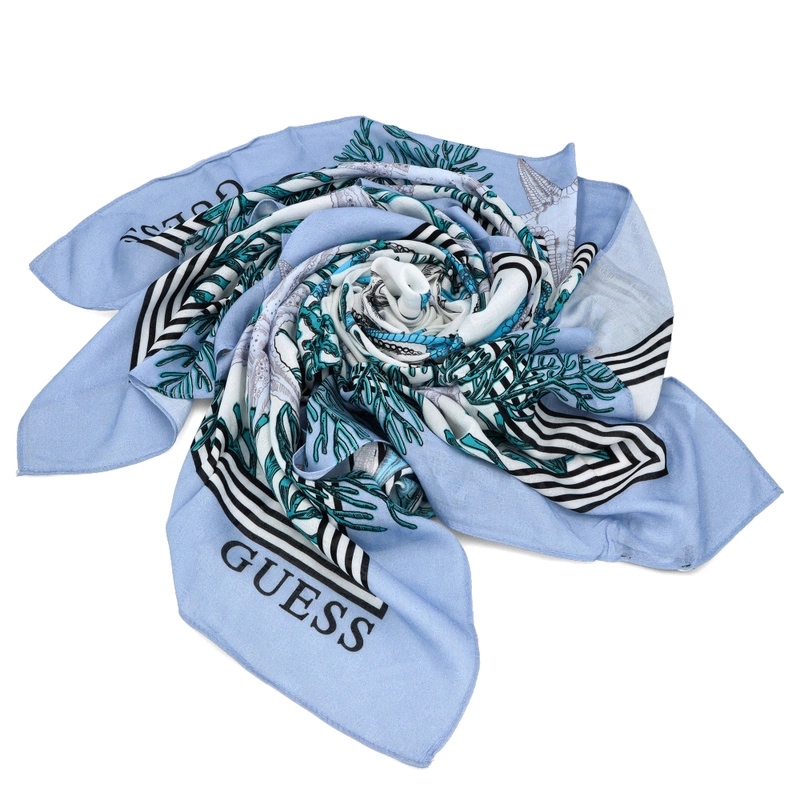 Шарф изготовлен из качественной, приятной на ощупь ткани, которая прекрасно облегает шею. Синий цвет придает образу свежесть и элегантность, а нежный принт с логотипом GUESS подчеркивает роскошный характер аксессуара. Его можно носить традиционно на шее, как украшение для волос, с сумочкой или на поясе – его универсальность допускает множество модных интерпретаций.