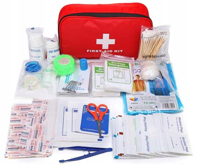 Аптечка укомплектована необходимыми предметами, полезными для оказания первой помощи в таких ситуациях, как волдыри на ногах во время похода, кровотечение из носа, царапины, ссадины, небольшие порезы кожи, незначительное кровотечение из конечности, а также небольшие ушибы или растяжения.