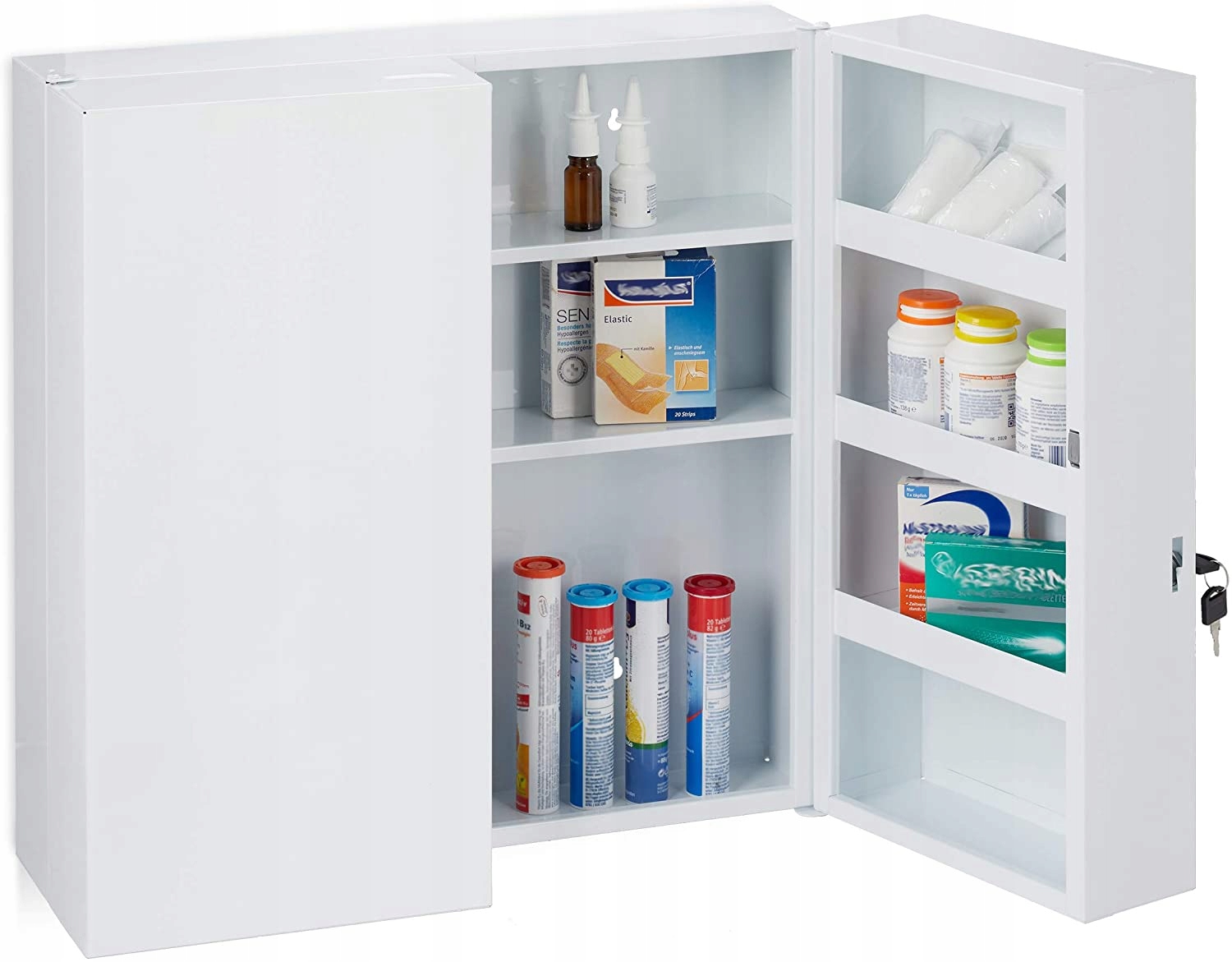 Эта большая аптечка позволяет вам держать важные предметы, необходимые для быстрого лечения, под рукой. Внутри аптечки имеется 11 отделений разного размера, в которых достаточно места для медикаментов, бинтов и предметов первой помощи. Для защиты от детей и посторонних лиц аптечка крепится высоко на стене и закрывается входящими в комплект ключами. Белый аптечный шкаф из стали поместится в ванной комнате или кабинете врача.