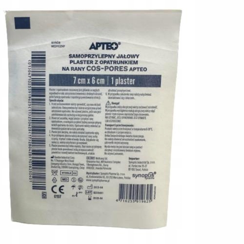 - Медицинское изделие Самоклеящийся пластырь для ран Cos-Pores Apteo Sterile представляет собой пластырь следующих размеров: 7см x 6см. Он показан для использования в экстренных случаях в качестве повязки для остановки кровотечения и защиты от раневой инфекции.