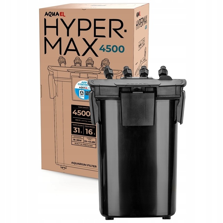 Aquael Hypermax BT — современный, высокопроизводительный ковшовый фильтр от польского производителя. Управляется из приложения. Предназначен для аквариумов объемом 200-1500 л. Это гарантирует эффективную механическую и биологическую фильтрацию. Встроенный предварительный фильтр ограничивает частоту очистки. Расход до 4500 л/ч. Мощность 18-36 Вт