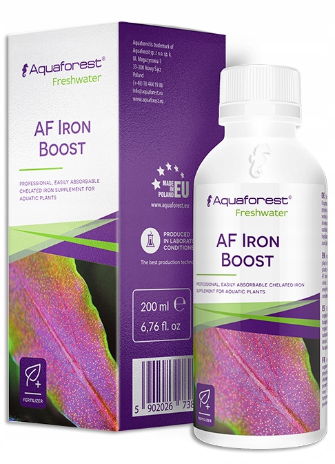 Профессиональная добавка легкоусвояемого железа для аквариумных растений. Железо принимает участие в различных обменных процессах, и прежде всего оно играет важную роль в синтезе хлорофилла – зеленого пигмента. От его присутствия зависит эффективность фотосинтеза. Всасывание железа зависит от содержания макро- и микроэлементов, pH и формы самого железа. Распространенной проблемой в аквариумах является дефицит железа, поскольку его форма недоступна для растений. Дефицит железа приводит к потере хлорофилла и, как следствие, развитию хлороза, проявляющегося пожелтением и некрозом листьев. Оптимальная концентрация железа в аквариумной воде должна составлять 0,1-1 мг/л. AF Iron Boost содержит концентрированную дозу легкоусвояемого хелата железа Fe2+ для аквариумных растений. КАК ИСПОЛЬЗОВАТЬ: 1 мл AF Iron Boost на 100 литров воды один раз в неделю. 1 мл AF Iron Boost, растворенный в 100 л воды, повышает уровень железа на 0,04 мг/л. Прием добавок следует продолжать до достижения удовлетворительных результатов. Рекомендуется использовать его параллельно с продуктами AF Micro и AF Macro. Абсорбенты, такие как цеолит и/или уголь, могут снизить эффективность препарата. Продукт предназначен исключительно для аквариумов. Защищайте от солнечных лучей. Хранить при комнатной температуре в плотно закрытой таре, в недоступном для детей месте.