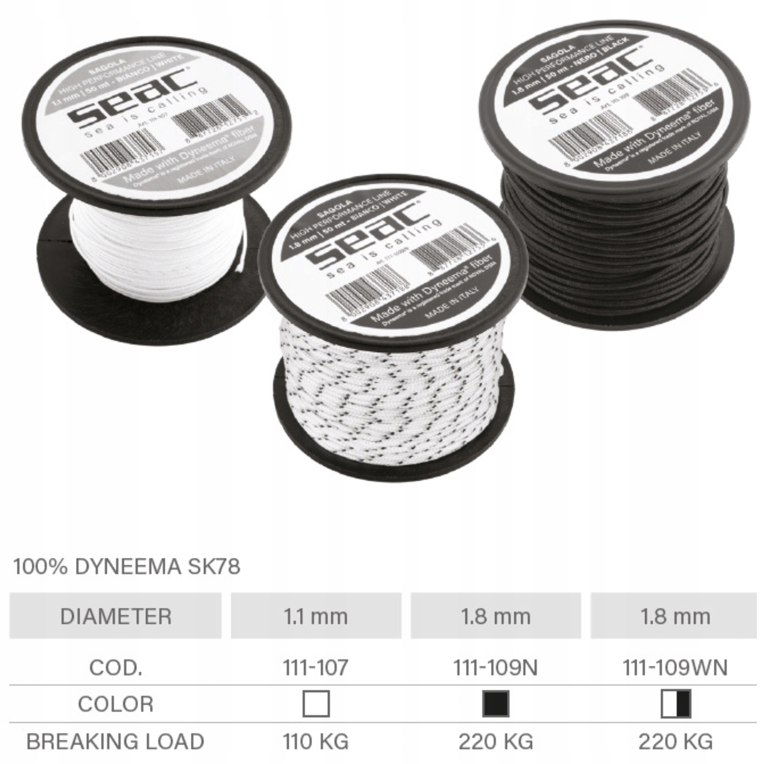 SEAC предлагает лески с намоткой длиной 50 м в 6 вариантах, разделенных на две группы.
