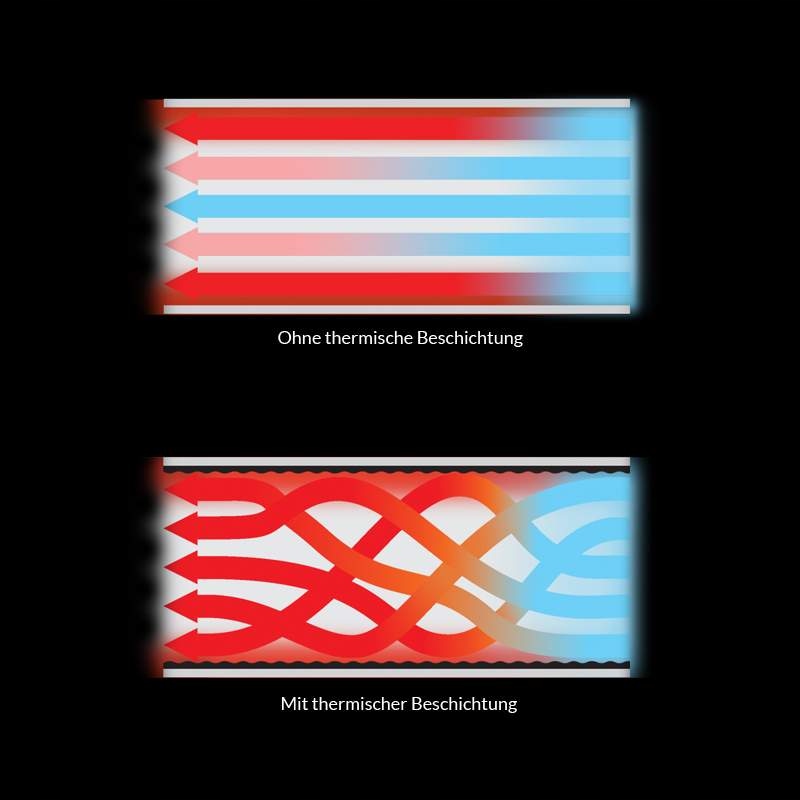 Тепловое покрытие создает микротурбалентность благодаря специальной поверхностной структуре. Наряду с открытыми тепловыми трубами, это приводит к оптимальному рассеянию тепла и, следовательно, к повышению эффективности охлаждения.