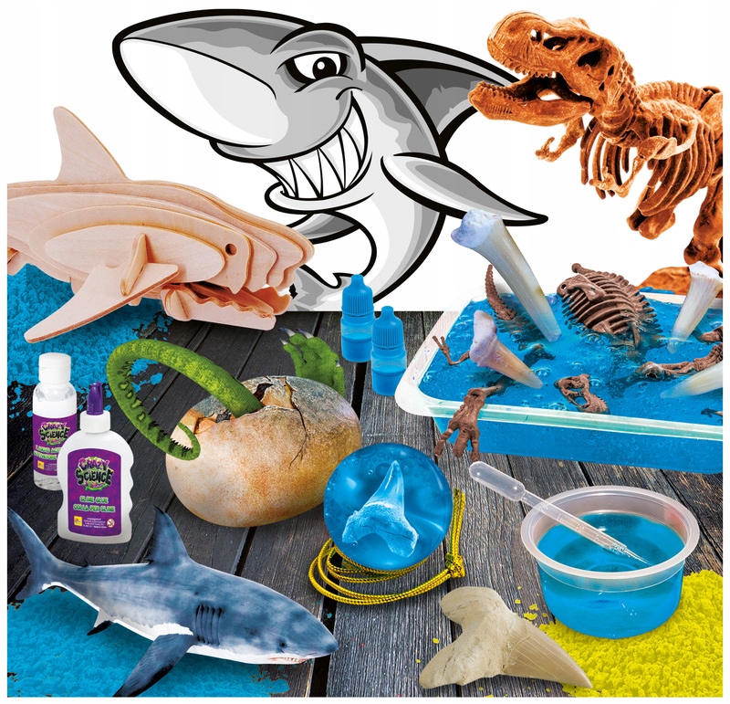 Акулы и динозавры, самые опасные хищники в мире, заключены в очень оригинальный научный набор! Это позволит вашему ребенку открыть для себя множество тайн и курьезов о самых известных морских и доисторических хищниках. Выкопайте яйца динозавра, постройте скелет тиранозавра и узнайте, что скрывается в уникальной слизи акулы!