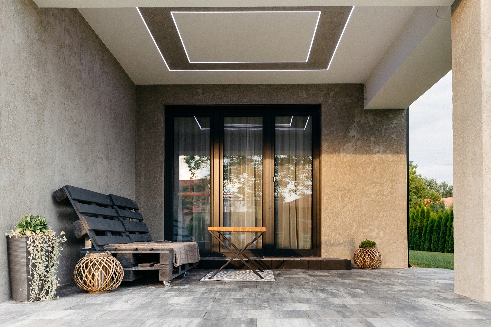 - Создайте стилистическую согласованность между зданием и окружающей средой. сад, соединив их бетонной штукатуркой.