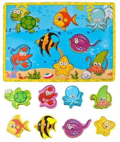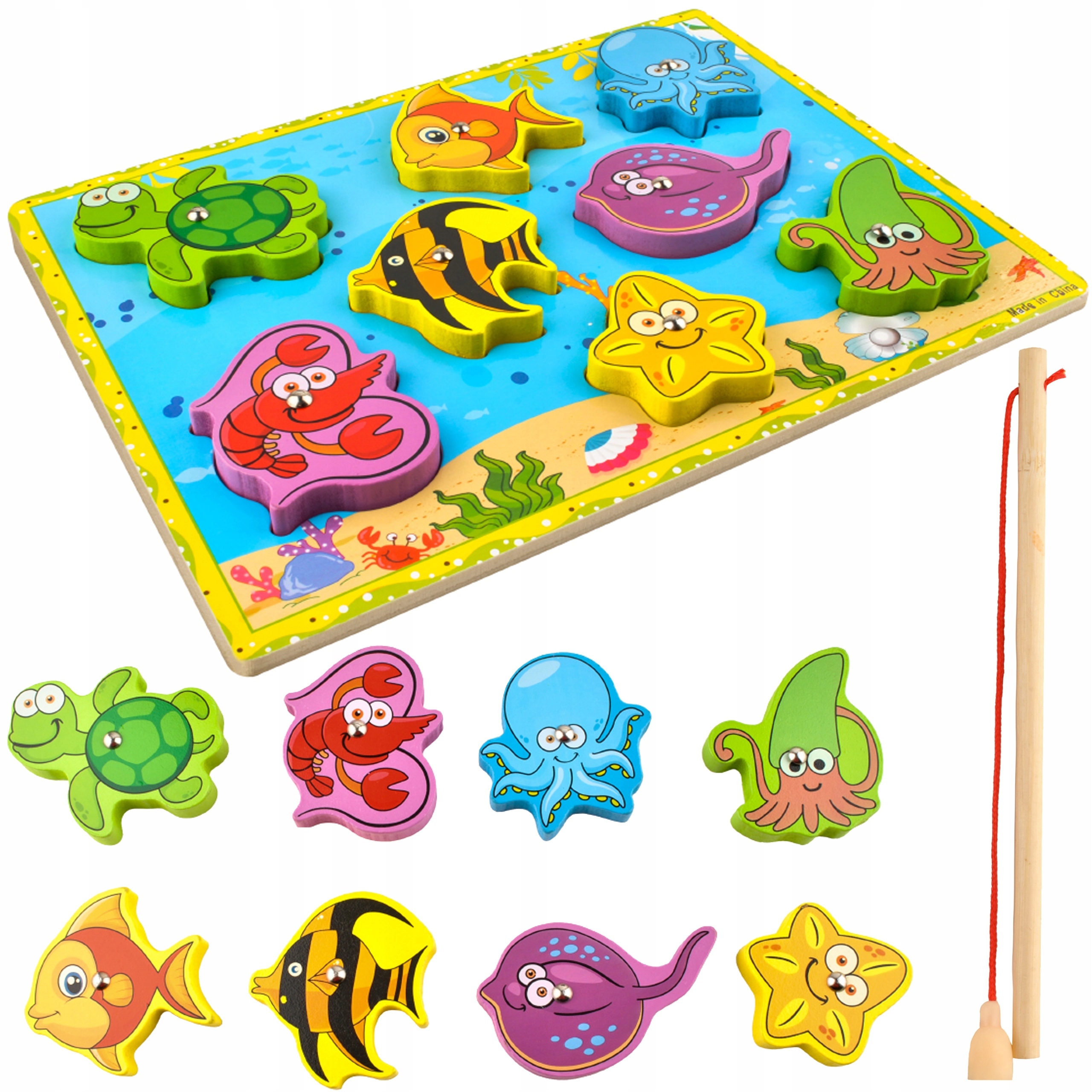 В комплект входят поднос, удочка и 8 деревянных морских животных.