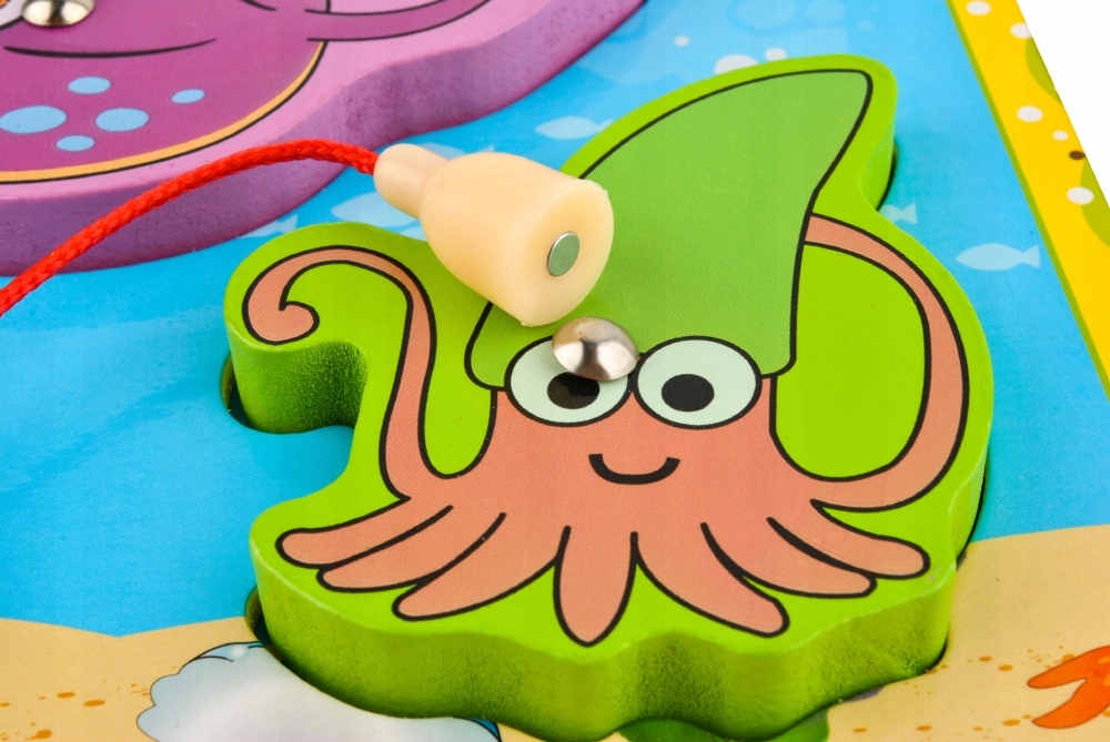 УЧИТ - в набор входит доска, на которой расположены 8 водных животных с металлическими булавками , в комплекте идет удочка, с помощью которой можно снимать животных с доски, магниты очень сильные, поэтому даже 3-летний ребенок без проблем сможет поймать рыбу.