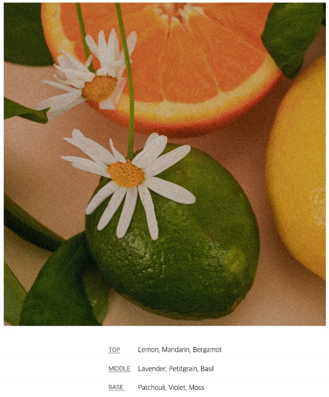 - Примечания к ароматизации: здоровая свежесть трав, лучистого лимона, зеленые цветочные акценты и теплые ноты Amber.