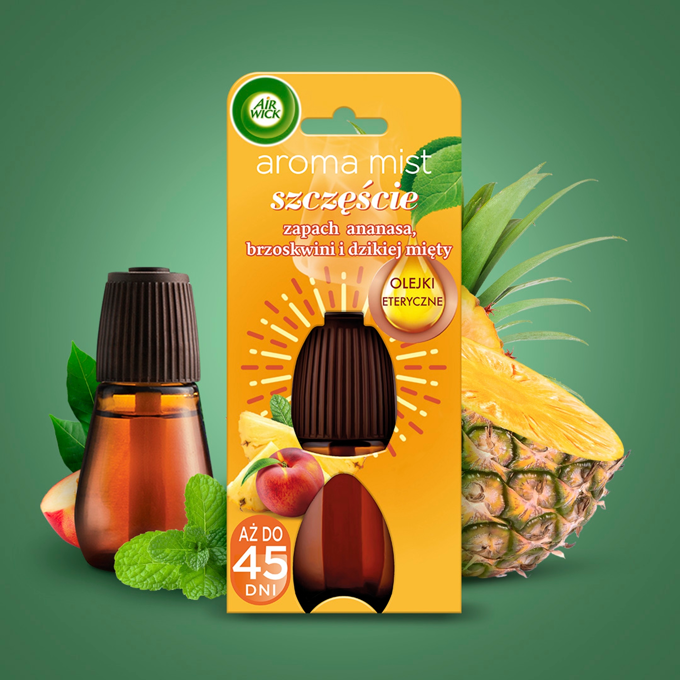 Пусть ваши мысли уносятся счастливыми моментами благодаря поднимающей настроение композиции ароматов ананас, персик и дикая мята. Новый аромат от Air Wick вдохновлен ароматерапией, которая поднимает нам хорошее настроение и успокаивает чувства.