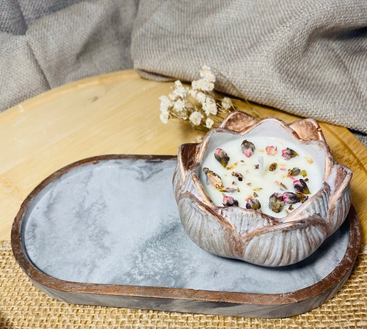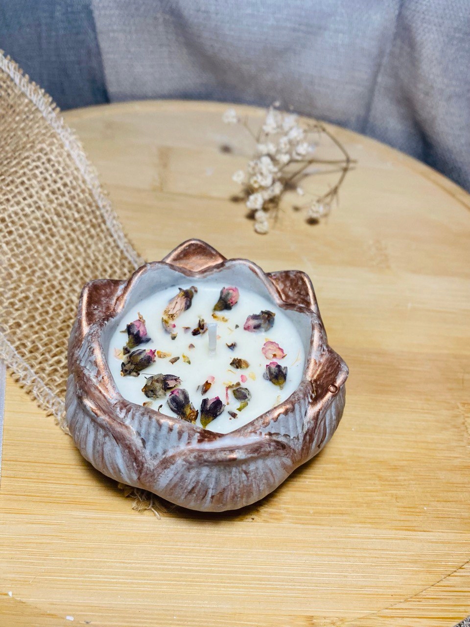 - Соевая свеча в гипсовом контейнере в форме цветка: Аккуратно сделано, сделано из натурального соевого воска, украшена сухоцветами. Форма, напоминающая цветок лотоса, прекрасно сочетается с естественной отделкой штукатурки.